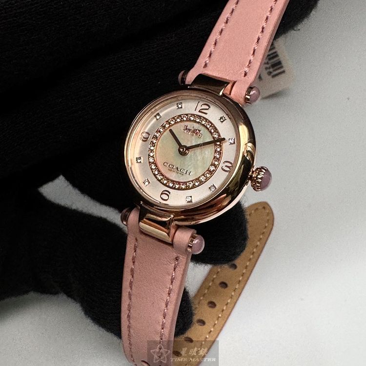 COACH手錶,編號CH00211,26mm玫瑰金圓形精鋼錶殼,貝母中二針顯示, 鑽圈錶面,粉紅真皮皮革錶帶款
