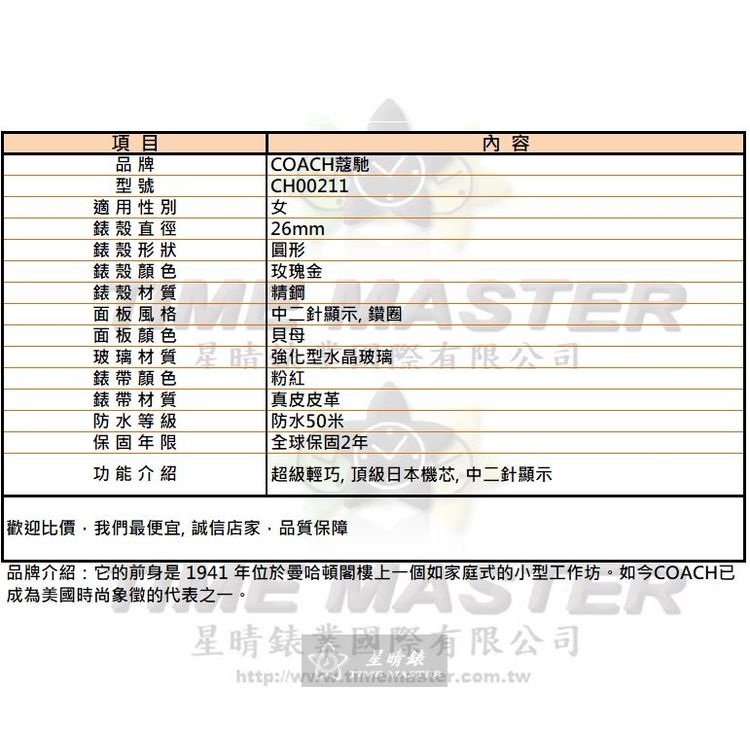 星晴錶業推出COACH蔻馳CH00211女錶,完美融合時尚與功能。 26mm圓形玫瑰金精鋼錶殼,展現優雅氣質。 貝母錶盤配鑽圈設計,增添奢華感。 粉紅真皮皮革錶帶,舒適又耐用。 超級輕巧的設計,適合日常佩戴。 搭載頂級日本石英機芯,提供精準計時。 強化型水晶玻璃,耐刮耐磨。 50米防水等級,游泳時也無需擔心。 全球2年保固,安心購買無後顧之憂。 COACH蔻馳CH00211,您的理想女錶選擇。 目前為止,此對話是否對你帶來幫助?