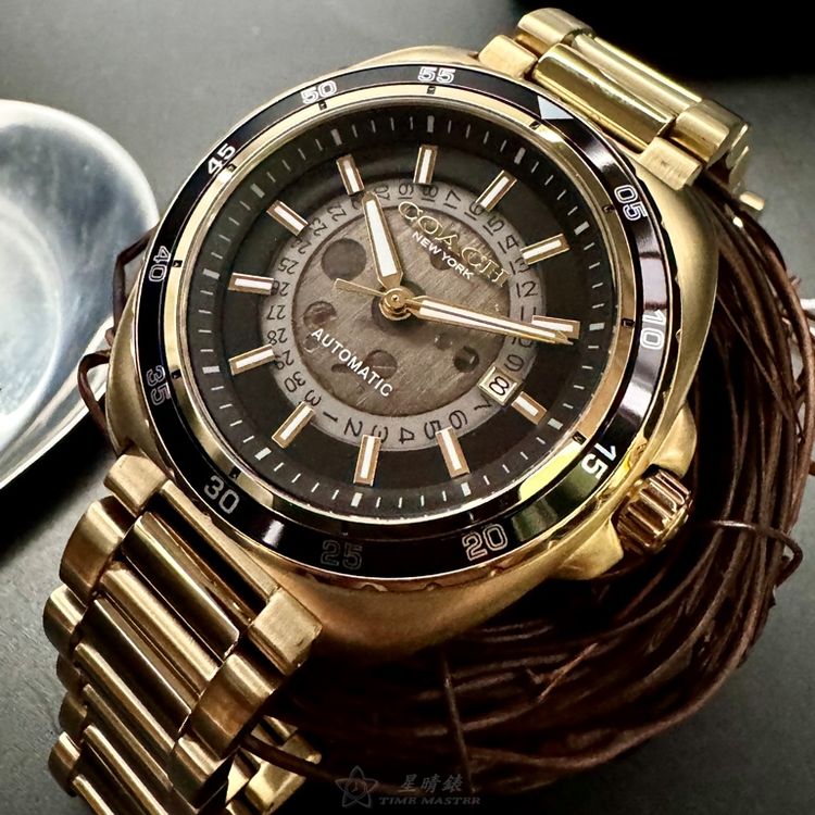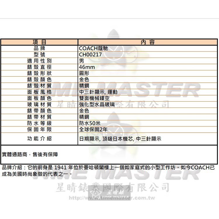 COACH手錶,編號CH00217,46mm金色圓形精鋼錶殼,雙面機械鏤空中三針顯示, 運動錶面,金色精鋼錶帶款