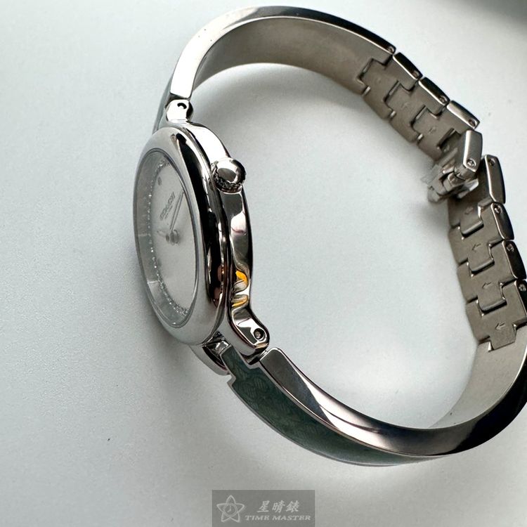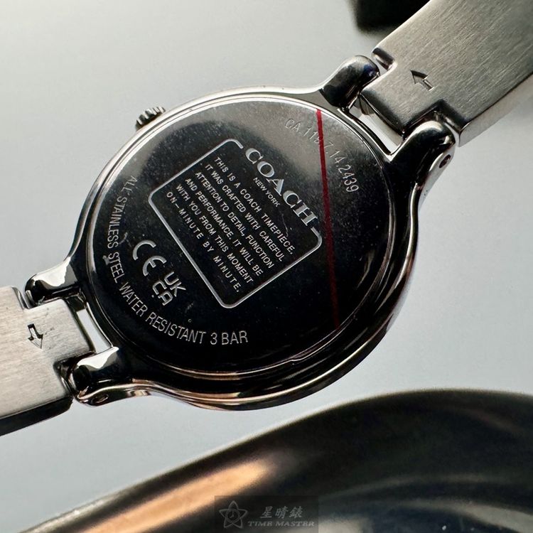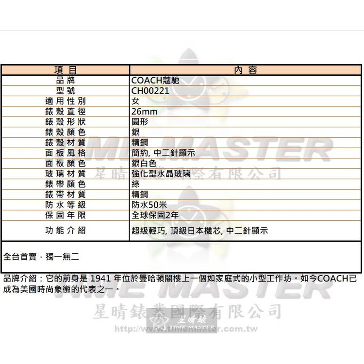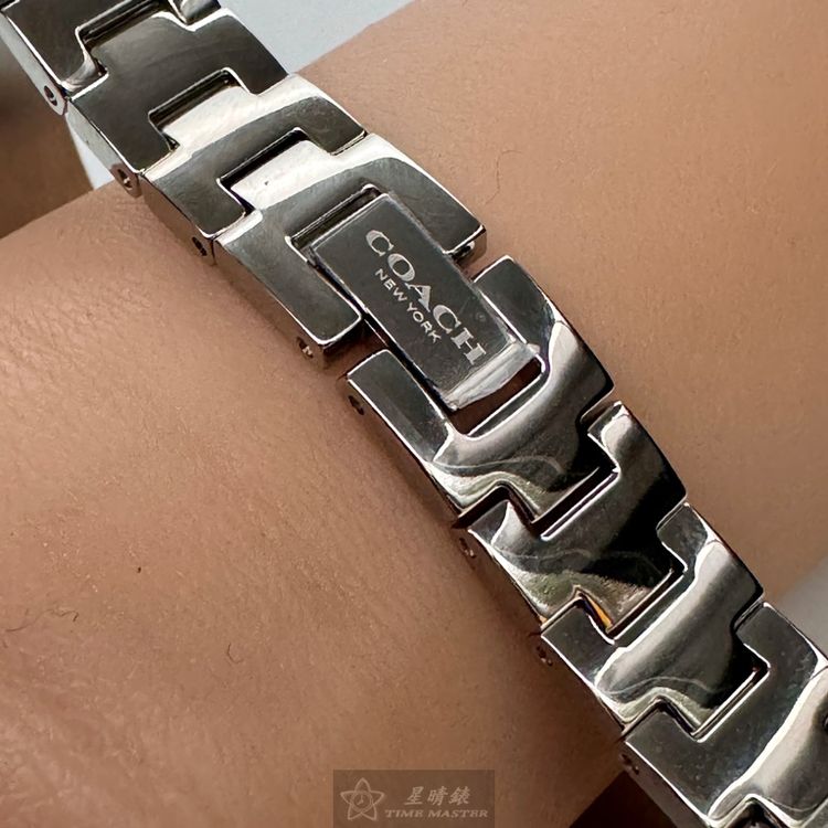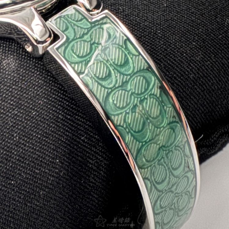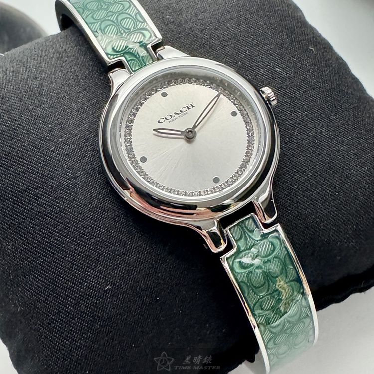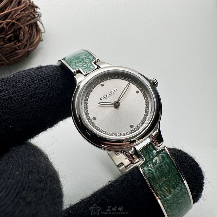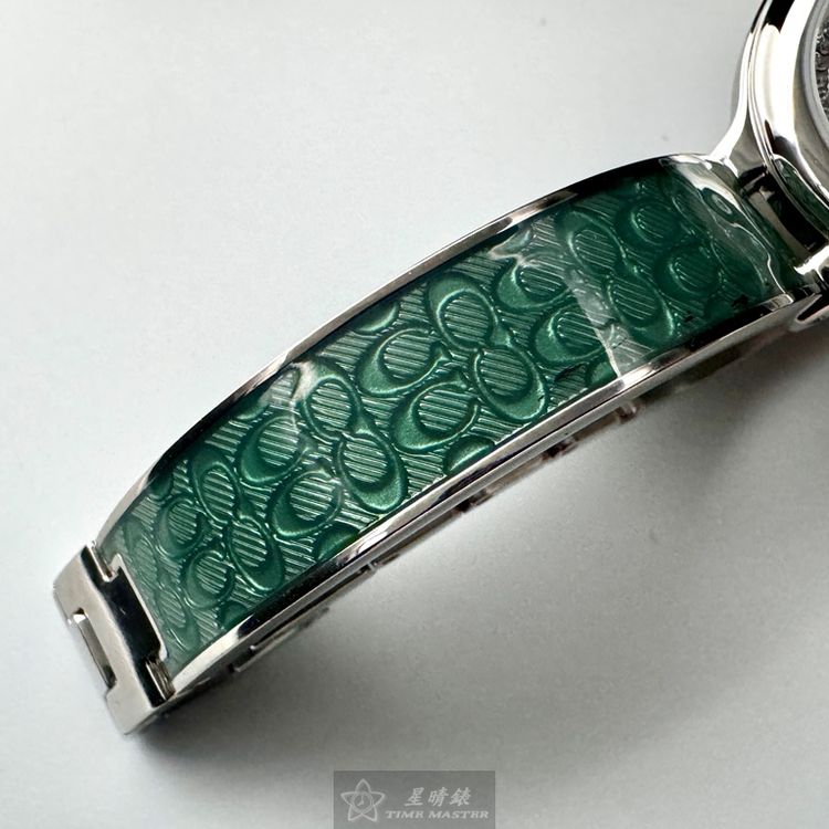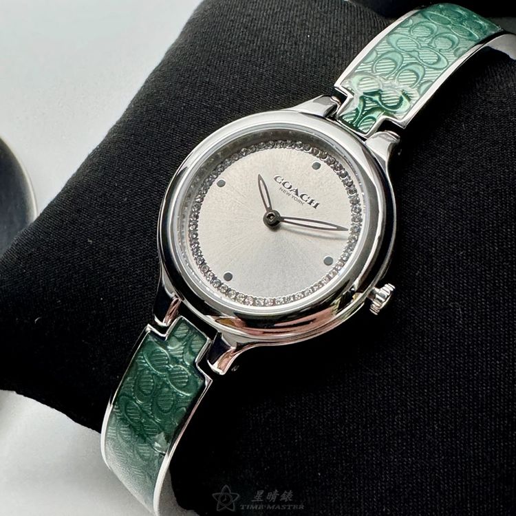 COACH手錶,編號CH00221,26mm銀圓形精鋼錶殼,銀白色簡約, 中二針顯示錶面,綠精鋼錶帶款,獨特C字手鐲雕刻
