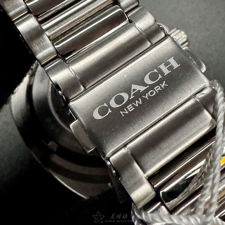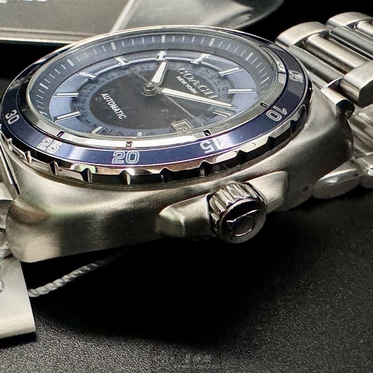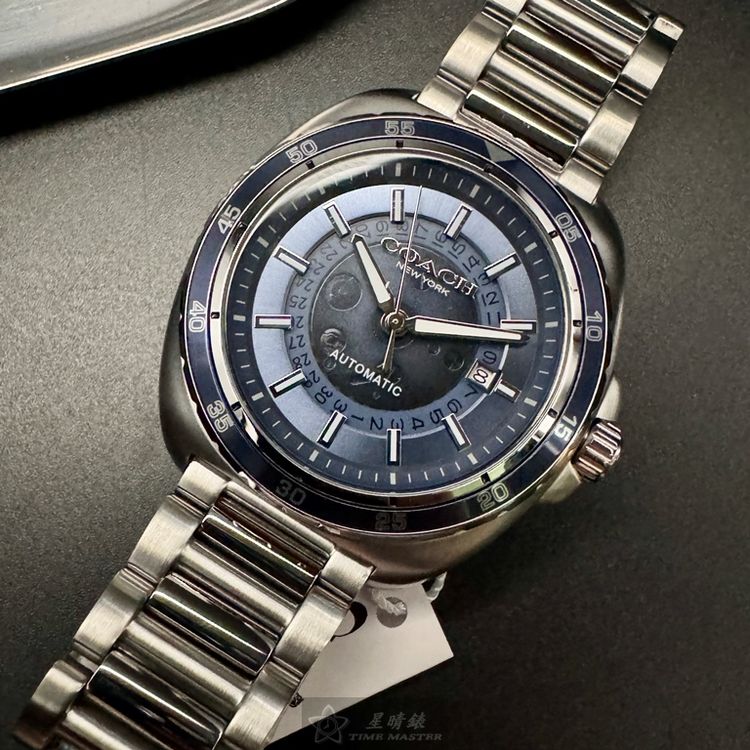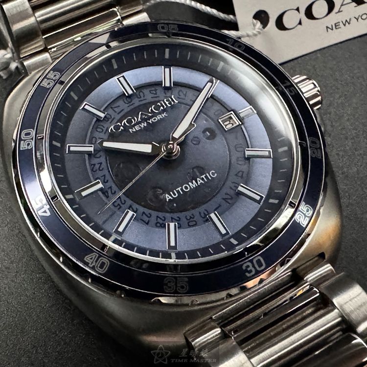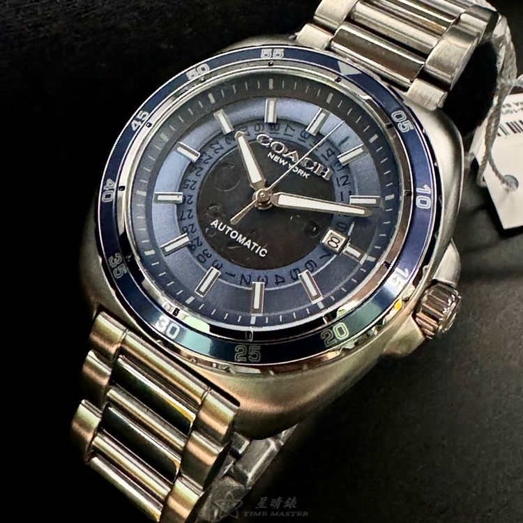 COACH手錶,編號CH00224,46mm寶藍圓形精鋼錶殼,寶藍色鏤空, 中三針顯示錶面,銀色精鋼錶帶款,稀有男機械錶