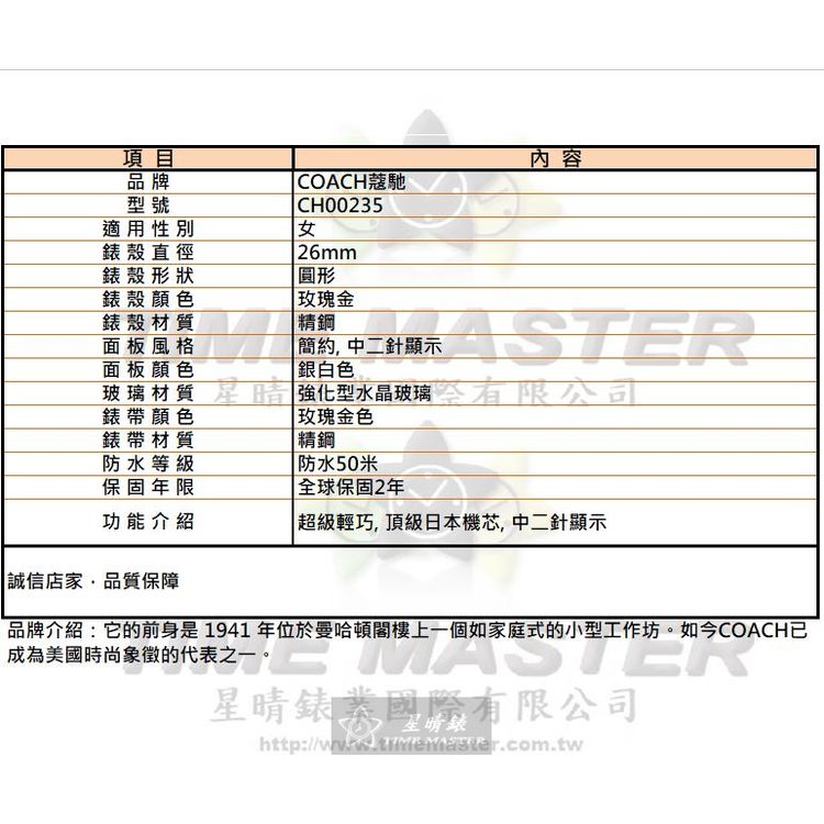 **COACH蔻馳 CH00235 女錶:精緻優雅,輕巧呈現** 1. **COACH蔻馳 CH00235 女錶**,融合了時尚與精工的完美設計,是每位現代女性的理想選擇。 2. 錶殼採用高質感的**玫瑰金精鋼材質**,展現優雅與奢華感,讓您的腕間閃耀迷人光芒。 3. **26mm圓形錶殼**,恰到好處的尺寸,適合任何手腕,無論正式場合或日常穿搭皆可輕鬆駕馭。 4. 錶面採用**銀白色簡約設計**,搭配中二針顯示,簡潔大方,清晰易讀,讓時間一目了然。 5. **頂級日本石英機芯**,提供精確的時間顯示,並且維持持久穩定的運行表現。 6. 配備**強化型水晶玻璃**,具備耐刮損與防撞功能,有效保護每一個細節。 7. 防水50米設計,無論是日常洗手還是淺水活動,都能安心佩戴。 8. **玫瑰金色精鋼錶帶**,不僅美觀,更具耐用性,貼合肌膚的感覺讓佩戴更為舒適。 9. 全球**2年保固**,讓您購買無憂,享受COACH蔻馳的品質保障。 10. COACH蔻馳 CH00235 女錶,不僅是一款計時工具,更是一種精緻生活態度的象徵。 這款COACH蔻馳女錶,無論是自用還是送禮,都能彰顯女性獨特的魅力與品味。