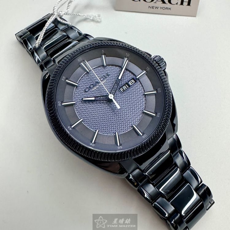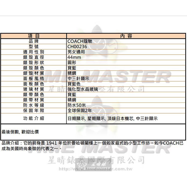 COACH手錶,編號CH00236,44mm寶藍圓形精鋼錶殼,寶藍色中三針顯示錶面,寶藍精鋼錶帶款