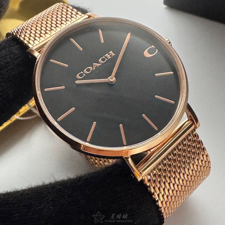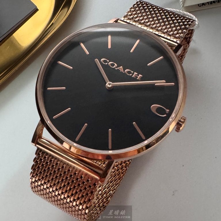COACH手錶,編號CH00243,42mm玫瑰金圓形精鋼錶殼,黑色簡約, 中二針顯示錶面,玫瑰金色米蘭錶帶款