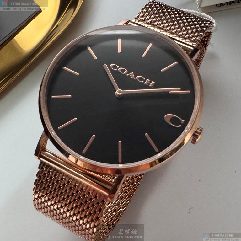 COACH手錶,編號CH00243,42mm玫瑰金圓形精鋼錶殼,黑色簡約, 中二針顯示錶面,玫瑰金色米蘭錶帶款