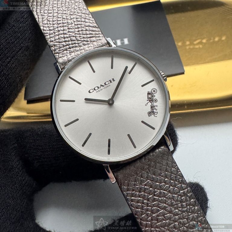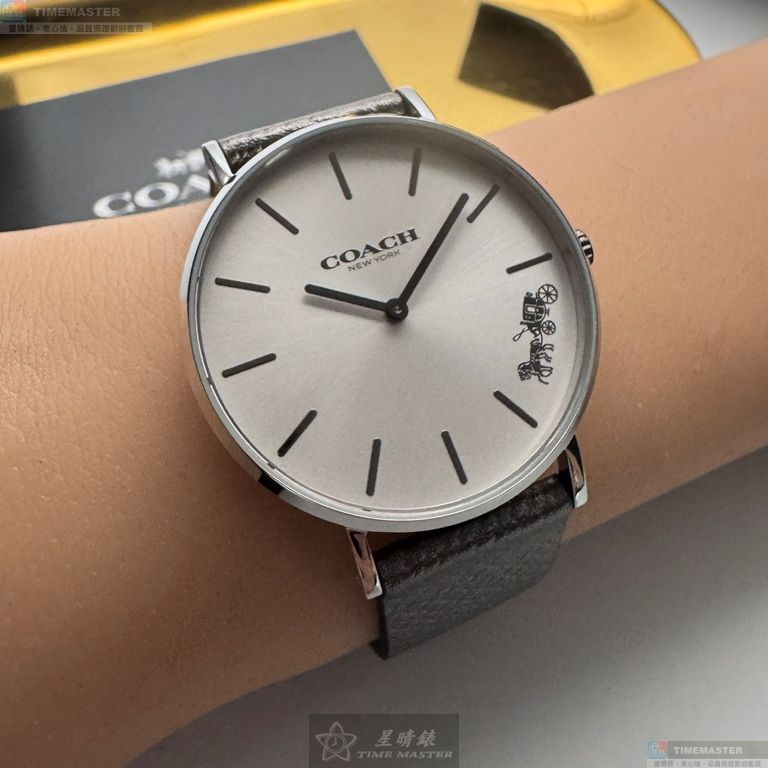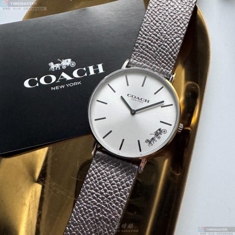 COACH手錶,編號CH00245,36mm銀圓形精鋼錶殼,白色簡約, 中二針顯示錶面,銀色真皮皮革錶帶款