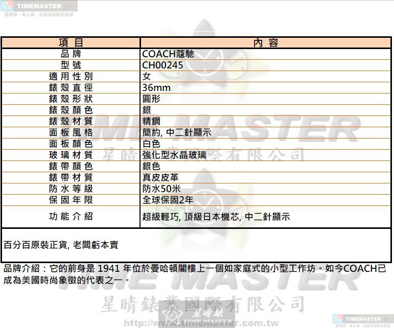 COACH蔻馳 CH00245 女錶,錶殼直徑36mm,是一款以實用與質感並重的中性設計時尚腕錶。 錶殼採用銀色精鋼打造,搭配強化型水晶玻璃,提升日常配戴的耐用度與防刮性能。 白色簡約面板搭配中二針顯示,展現出剛剛好的簡潔美感,沒有多餘裝飾,卻不失溫柔細節。 搭配銀色真皮錶帶,柔軟服貼手腕,適合長時間佩戴不易疲勞,實在好戴。 內部搭載頂級日本石英機芯,時間穩定可靠,對於日常使用者來說,是經得起時間考驗的實用選擇。 雖然價格並非市面上最便宜,但保證原廠正貨,購買更有保障,免去仿品疑慮。 防水50米的性能讓它不只能配戴於日常,更能安心應對突如其來的天氣變化。 全球保固兩年,是星晴錶業對每一位配戴者的承諾,不只是賣錶,更是對品質的堅持。 這款錶並非追求誇張亮點的商品,而是在細節與日常中的實用中默默發光。 我們不是在推銷商品,而是肩負讓每一位顧客戴上值得信賴腕錶的責任。