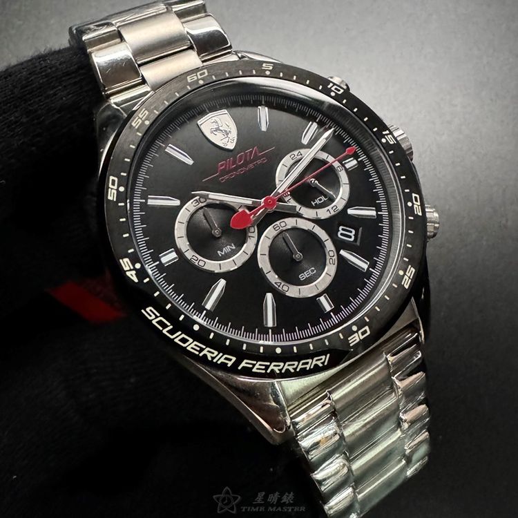 FERRARI手錶,編號FE00079,46mm銀圓形精鋼錶殼,黑色三眼, 中三針顯示, 運動錶面,銀色精鋼錶帶款