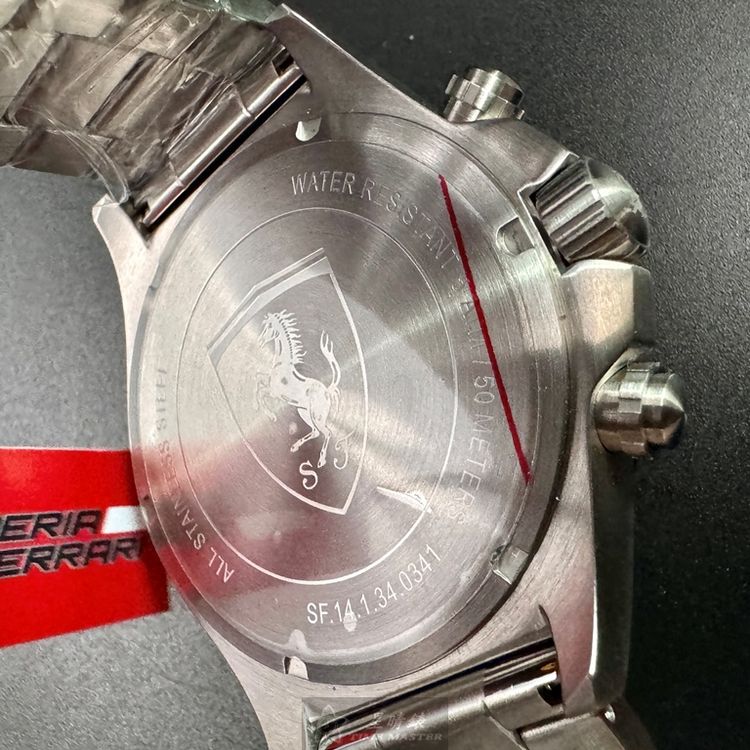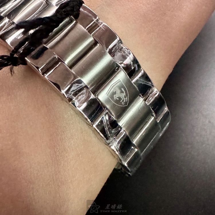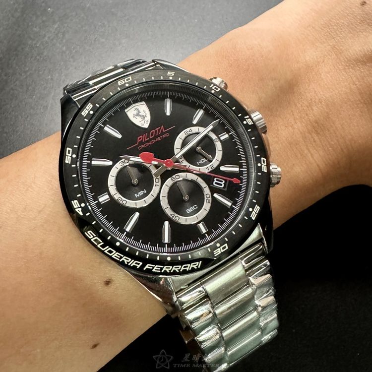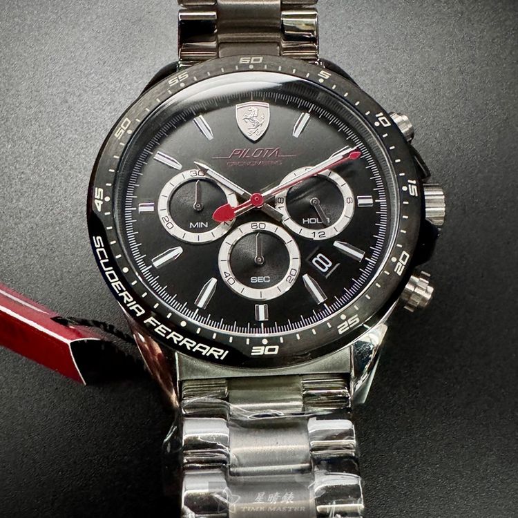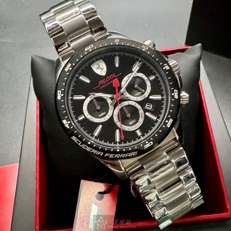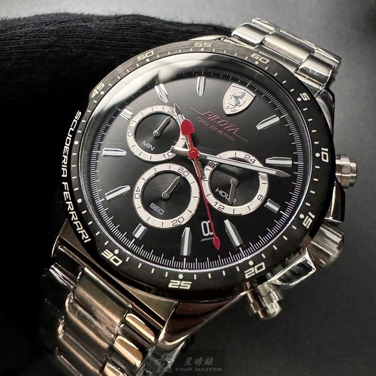 FERRARI手錶,編號FE00079,46mm銀圓形精鋼錶殼,黑色三眼, 中三針顯示, 運動錶面,銀色精鋼錶帶款