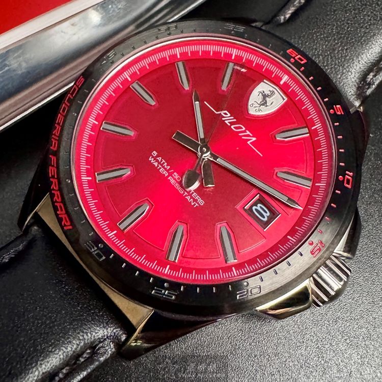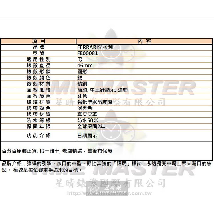 FERRARI法拉利 FE00081 男錶,錶殼直徑46mm,銀色精鋼搭配紅色面板,是一款外型簡約卻藏有細節的運動型腕錶。 我們明白這支錶可能不是市面上最強規格,但它的每一處工藝都對得起FERRARI的名字。 由星晴錶業嚴選引進,全新正貨,拒絕任何水貨或來源不明商品,是我們堅守的底線。 紅色中三針搭配日期顯示功能,不多不少,剛剛好地對應日常配戴所需。 強化型水晶玻璃覆蓋錶面,耐磨不怕輕微碰撞,生活中的小細節都已考慮周全。 搭配深黑色真皮錶帶,佩戴舒適服貼,不只是外觀上的配合,也兼顧實際使用感受。 防水50米設計,雖不建議戴著潛水,但應付日常洗手或雨天綽綽有餘。 價格不走低價競爭路線,因為我們更在意您收到手中的是貨真價實、該有的都有。 我們賣的不只是手錶,是將時間與責任交到您手上的信任與承諾。 星晴錶業肩負的,是讓每一位顧客都買得安心、戴得理直氣壯的使命感。