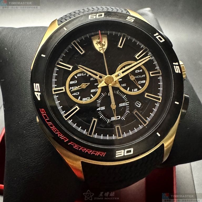 FERRARI手錶,編號FE00106,46mm金色圓形精鋼錶殼,黑色三眼, 中三針顯示, 運動錶面,深黑色矽膠錶帶款