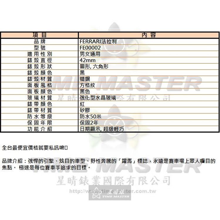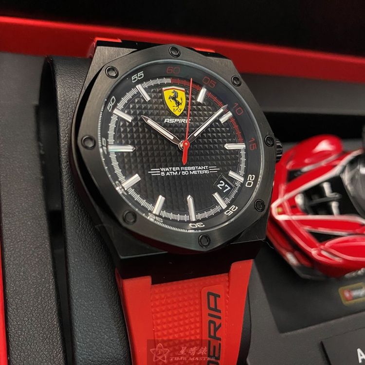 FERRARI法拉利男女通用錶,編號FE00002,42mm黑圓形, 八角形精鋼錶殼,黑色方格紋錶面,紅矽膠錶帶款
