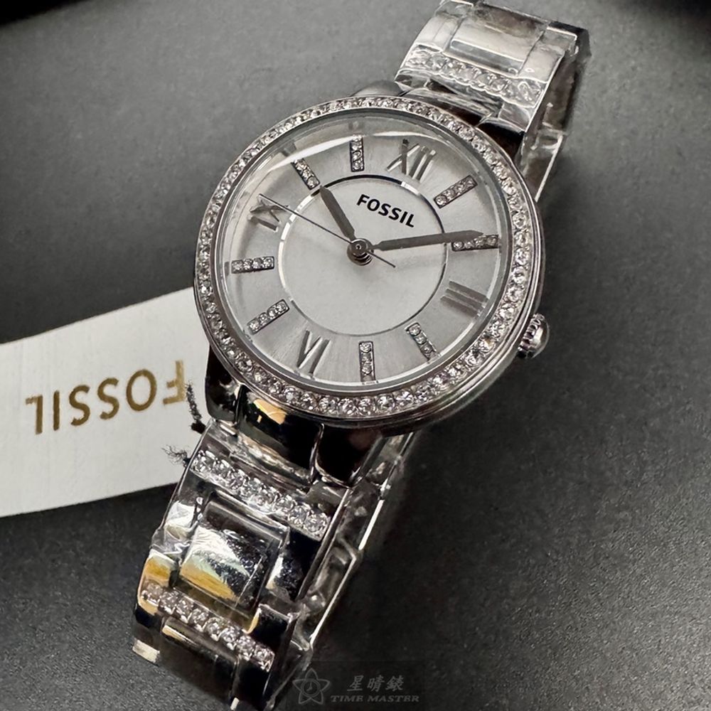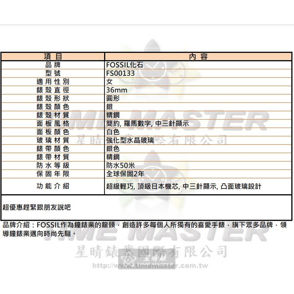 FOSSIL手錶,編號FS00133,36mm銀圓形精鋼錶殼,白色簡約, 羅馬數字, 中三針顯示錶面,銀色精鋼錶帶款
