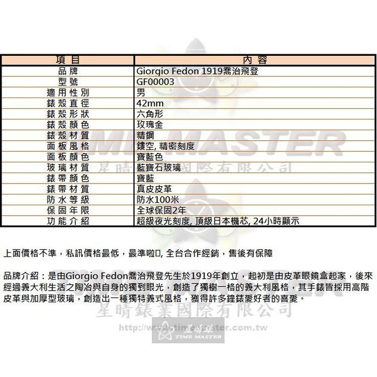 Giorgio Fedon 1919喬治飛登男錶,編號GF00003,42mm玫瑰金錶殼,寶藍錶帶款