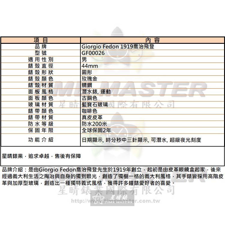 GiorgioFedon1919手錶,編號GF00026,44mm玫瑰金錶殼,咖啡色錶帶款