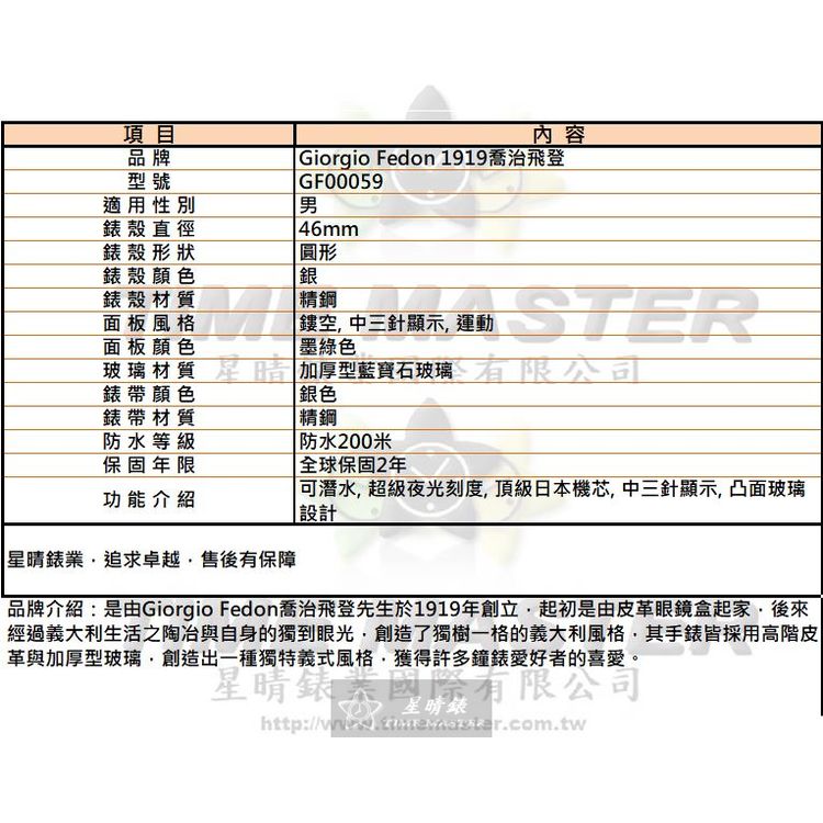 GiorgioFedon1919手錶,編號GF00059,46mm銀錶殼,銀色錶帶款