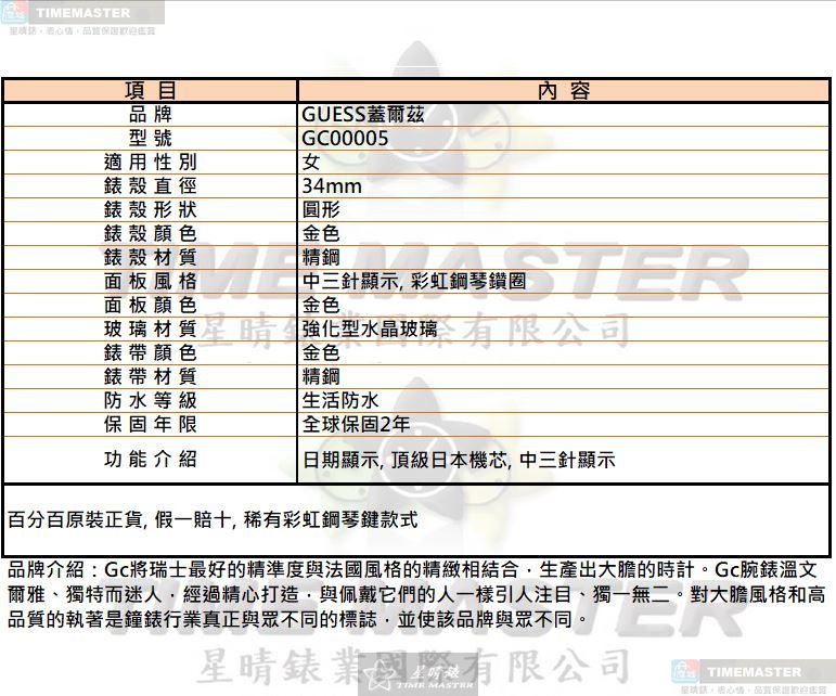 GUESS手錶,編號GC00005,34mm金色圓形精鋼錶殼,金色中三針顯示, 彩虹鋼琴鑽圈錶面,金色精鋼錶帶款