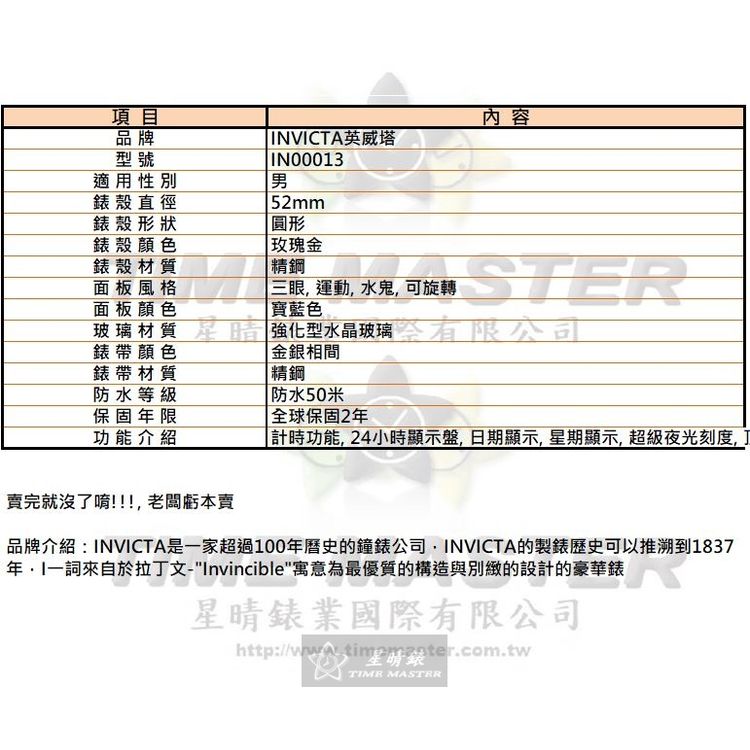INVICTA手錶,編號IN00013,52mm玫瑰金錶殼,金銀相間錶帶款