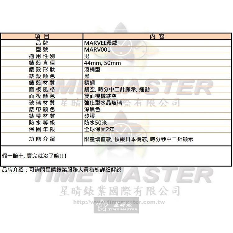 MARVEL漫威鋼鐵人限量手錶,送光學無線滑鼠!!編號MARV001,44mm, 50mm黑錶殼,深黑色錶帶款-[置頂推薦]