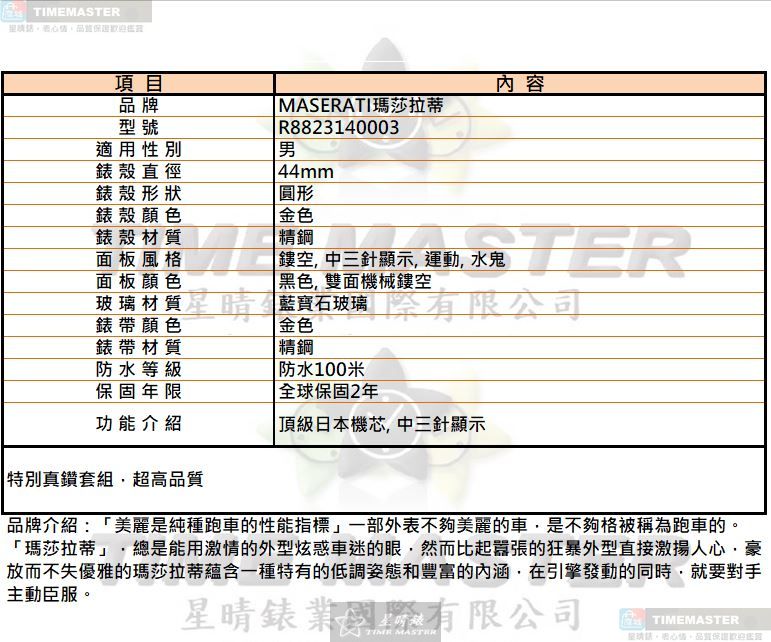 MASERATI手錶,編號R8823140003,44mm金色錶殼,金色錶帶款