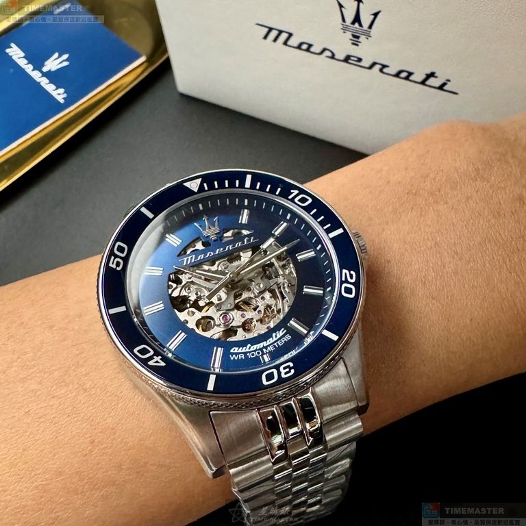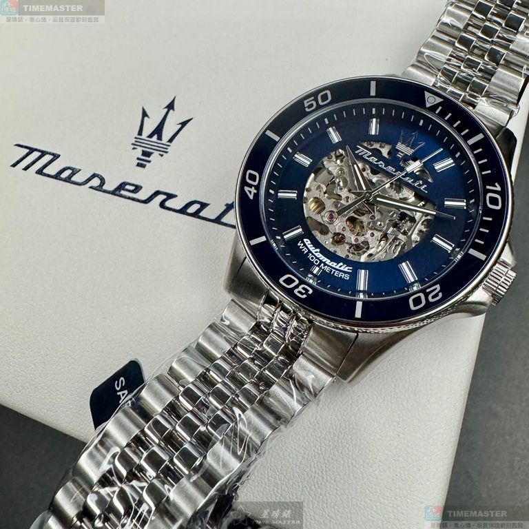 MASERATI手錶,編號R8823140011,44mm寶藍錶殼,銀色錶帶款