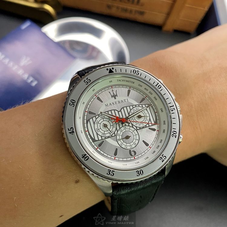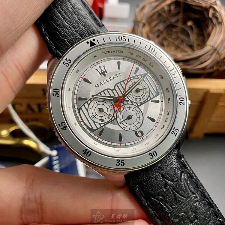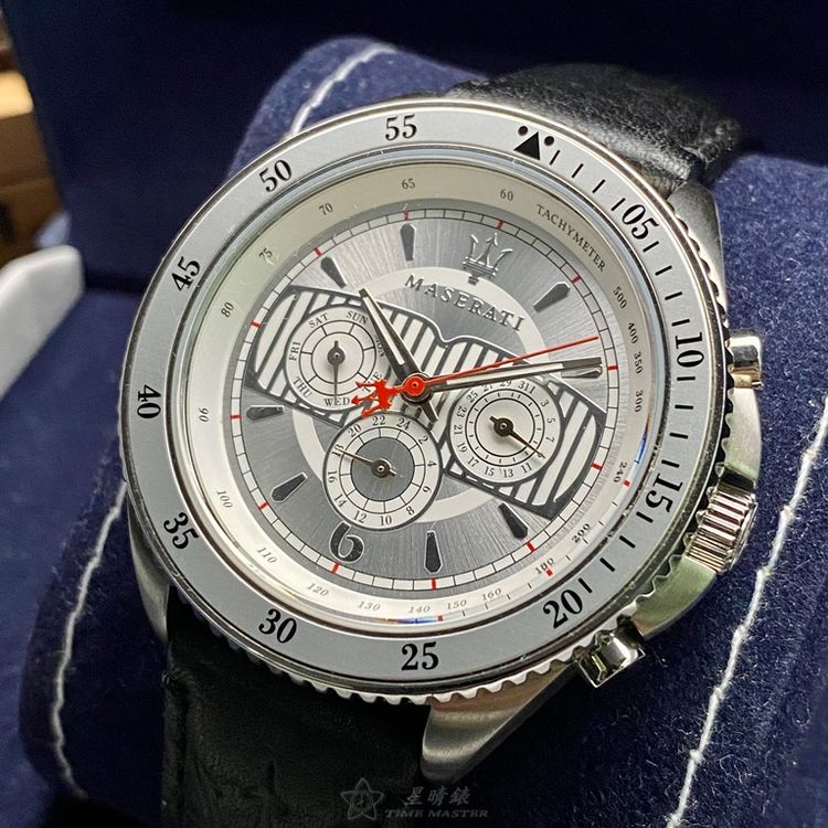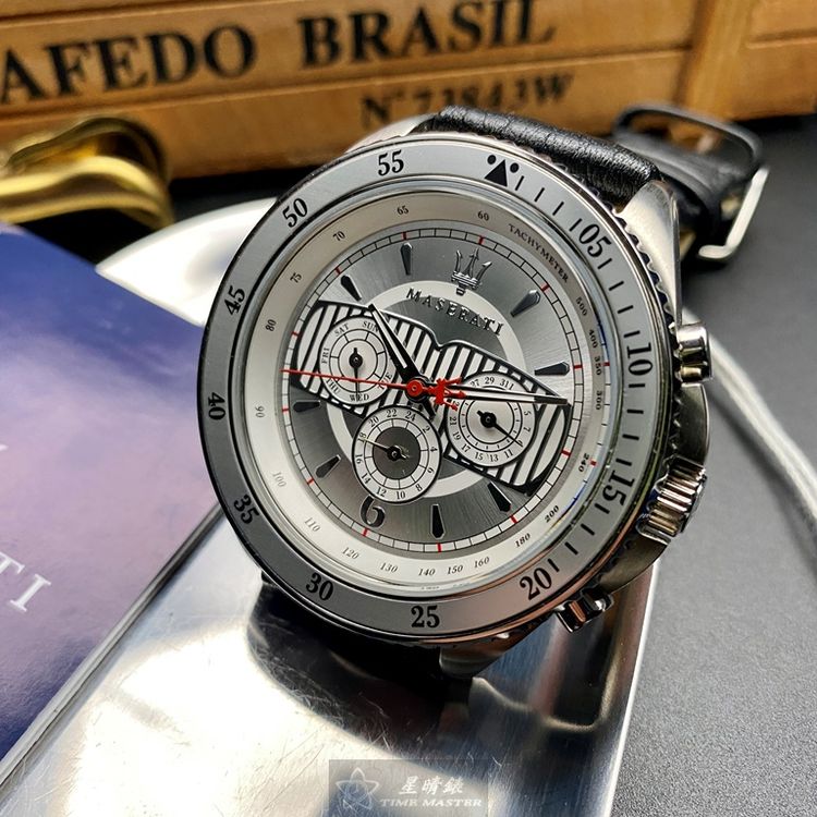 MASERATI手錶,編號R8851101004,46mm銀圓形精鋼錶殼,銀色三眼, 運動錶面,深黑色真皮皮革錶帶款