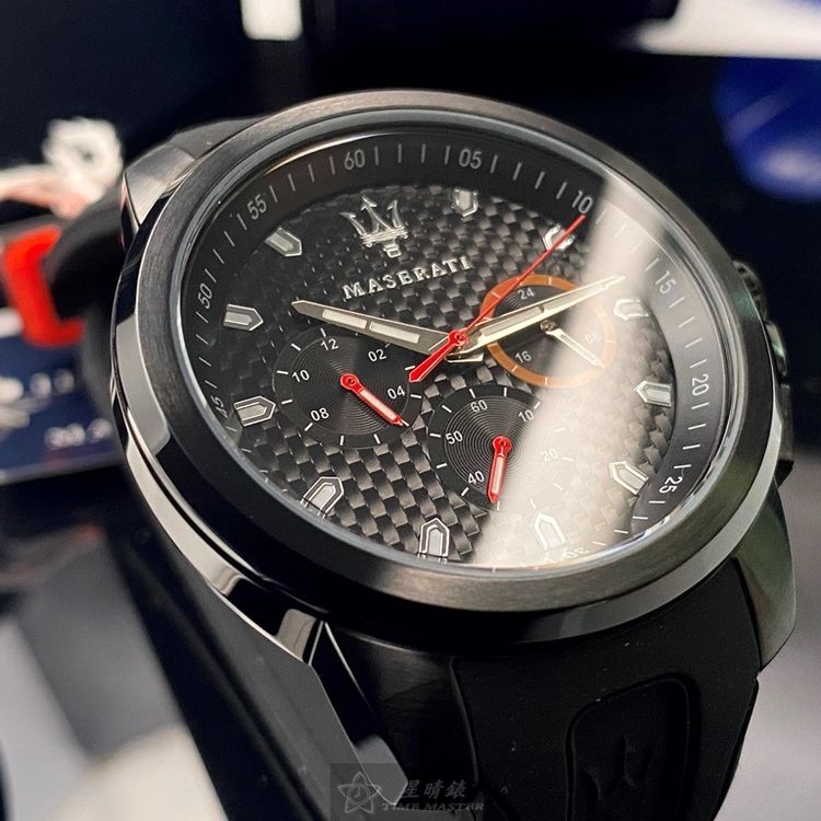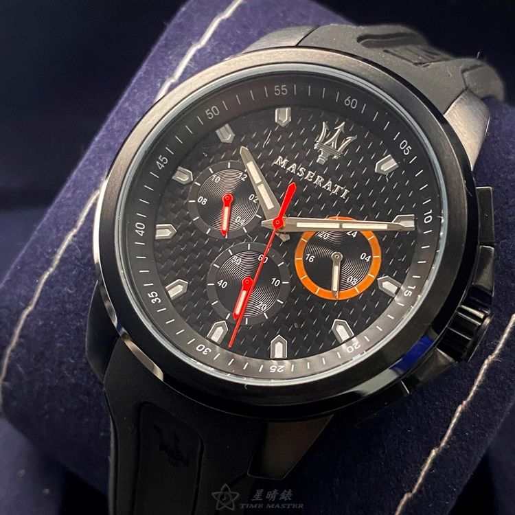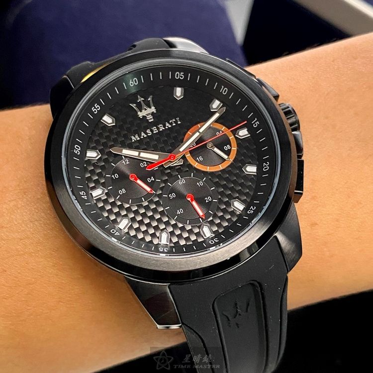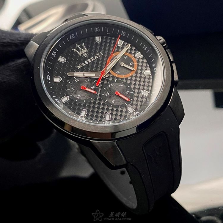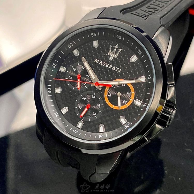 MASERATI手錶,編號R8851123007,44mm黑圓形精鋼錶殼,黑色三眼, 運動錶面,深黑色矽膠錶帶款