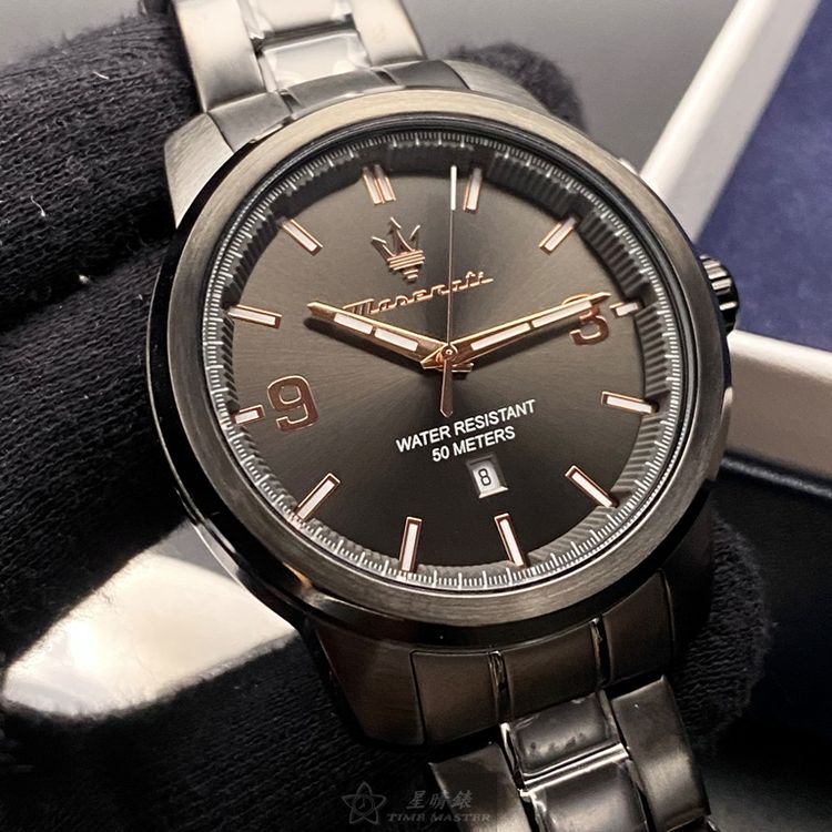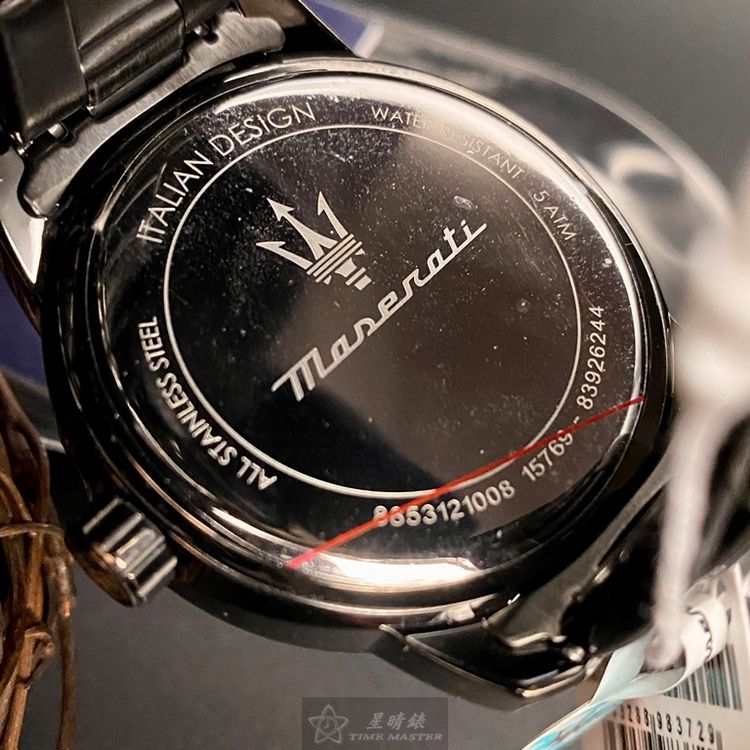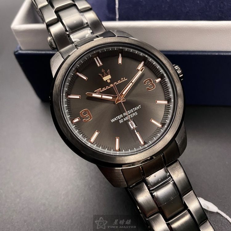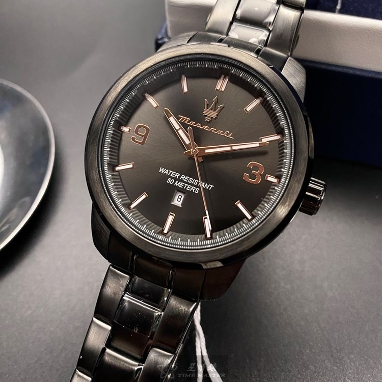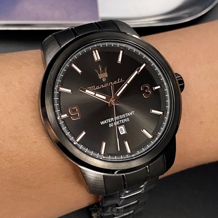 MASERATI手錶,編號R8853121008,44mm黑圓形精鋼錶殼,黑色簡約, 中三針顯示錶面,深黑色精鋼錶帶款