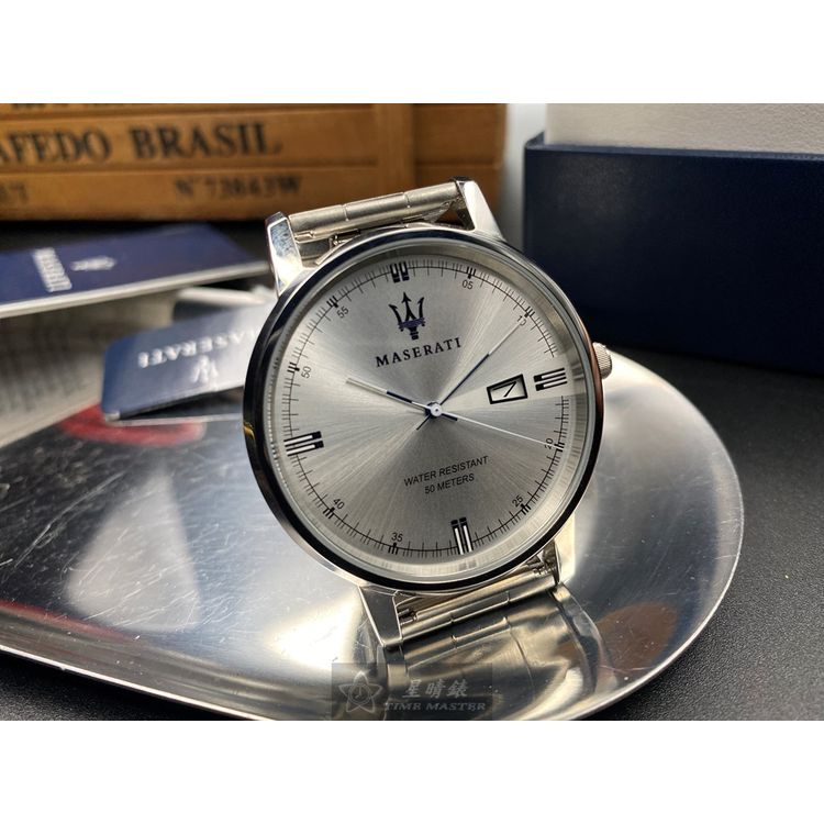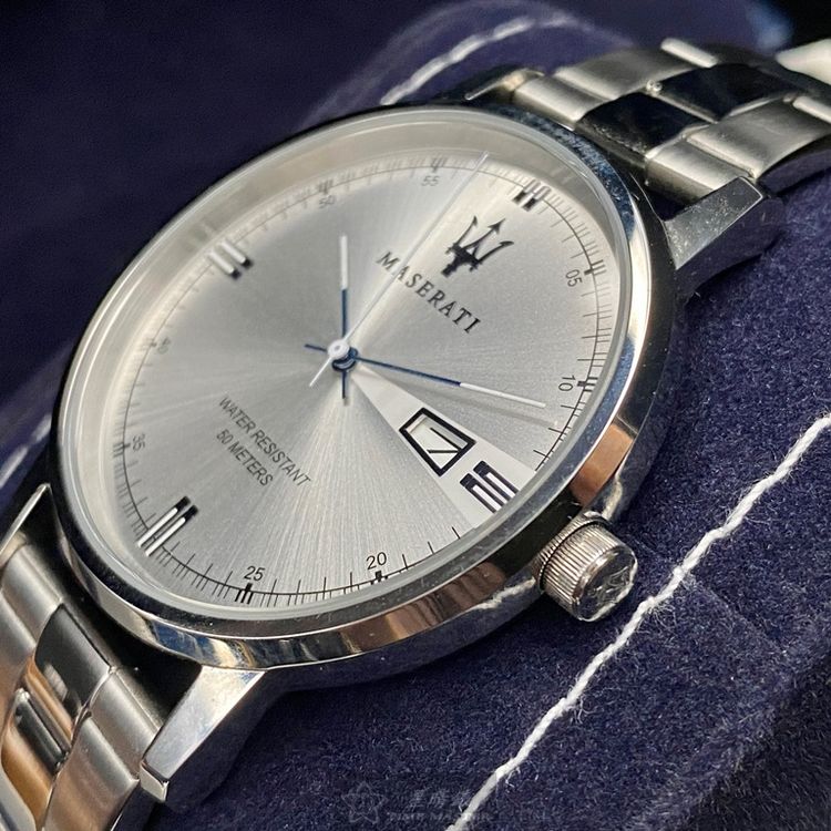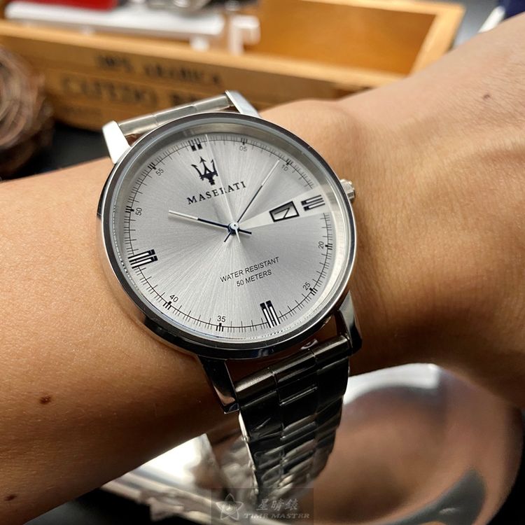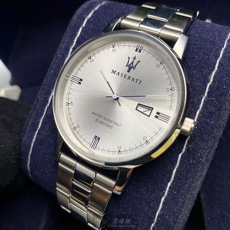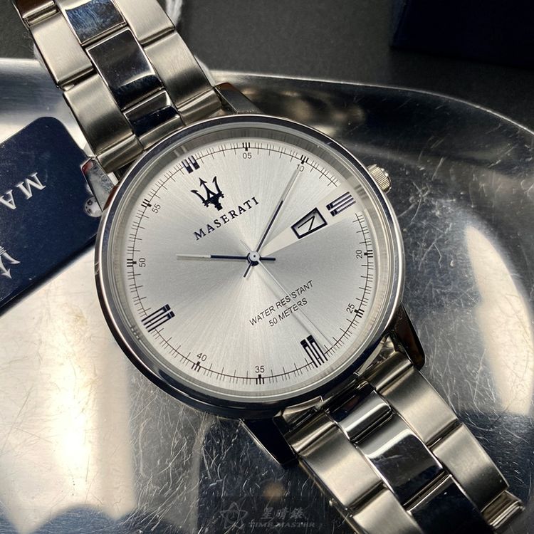 MASERATI手錶,編號R8853130001,42mm銀圓形精鋼錶殼,白色簡約, 中三針顯示錶面,銀色精鋼錶帶款
