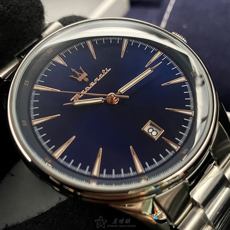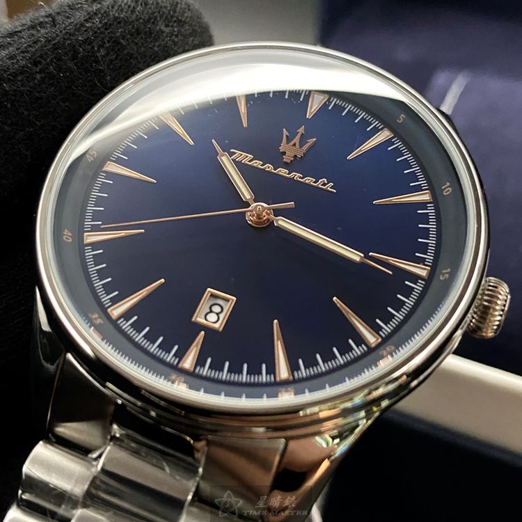 MASERATI手錶,編號R8853146002,46mm銀圓形精鋼錶殼,寶藍色中三針顯示錶面,銀色精鋼錶帶款