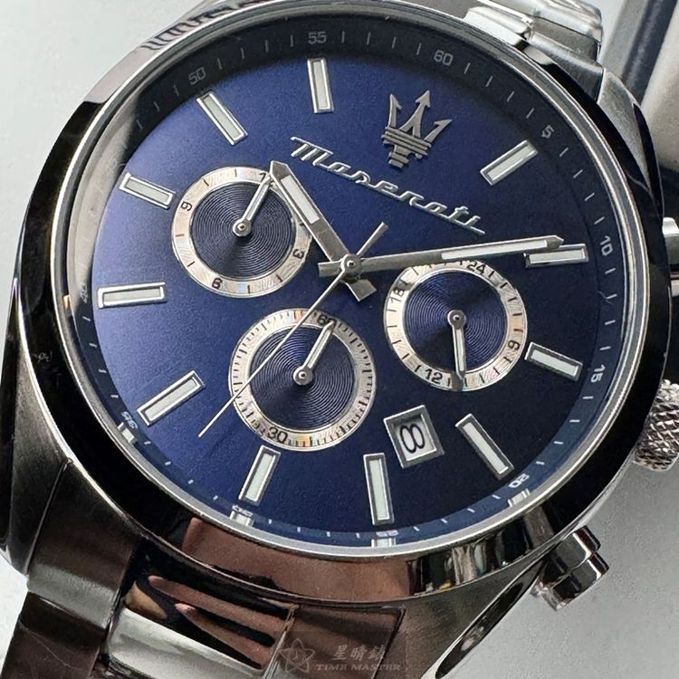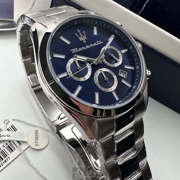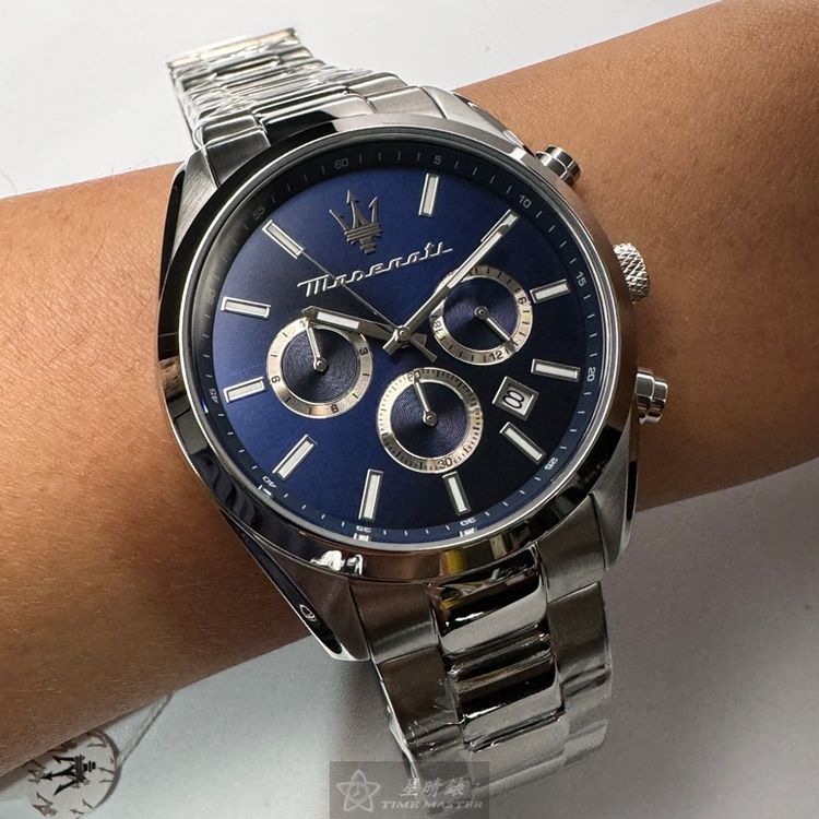 MASERATI手錶,編號R8853151005,42mm銀圓形精鋼錶殼,寶藍色三眼, 中三針顯示錶面,銀色精鋼錶帶款