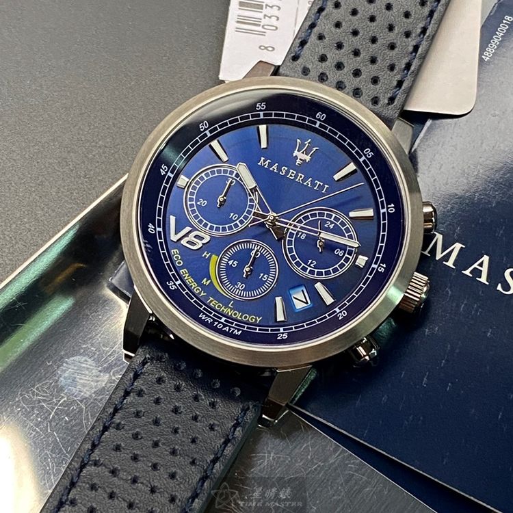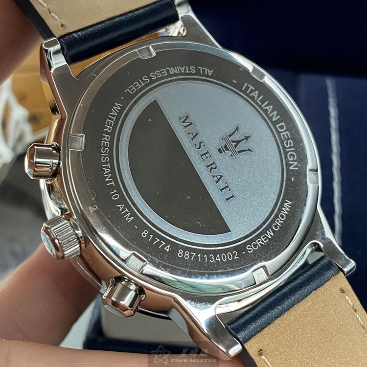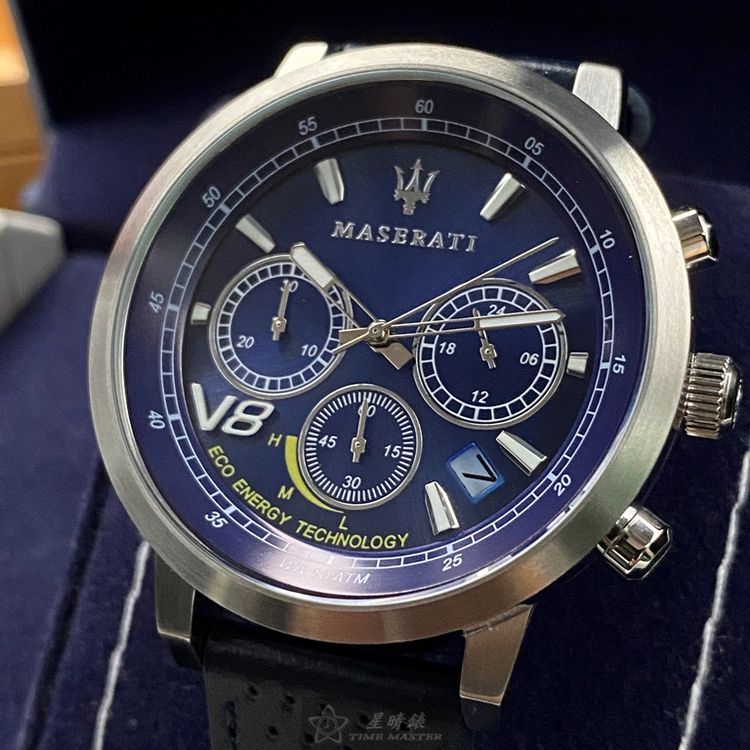 MASERATI手錶,編號R8871134002,44mm銀圓形精鋼錶殼,寶藍色運動, 精密刻度錶面,寶藍真皮皮革錶帶款