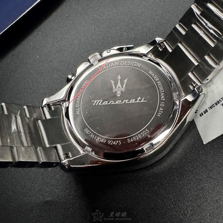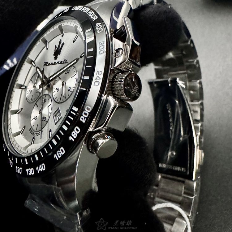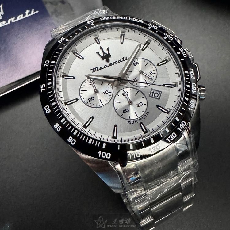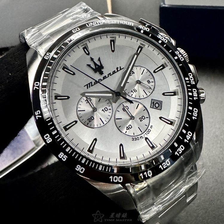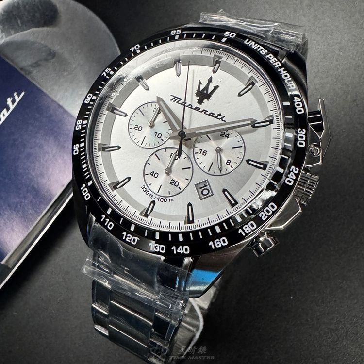 MASERATI手錶,編號R8873612049,46mm黑圓形精鋼錶殼,白色中三針顯示, 運動錶面,銀色精鋼錶帶款