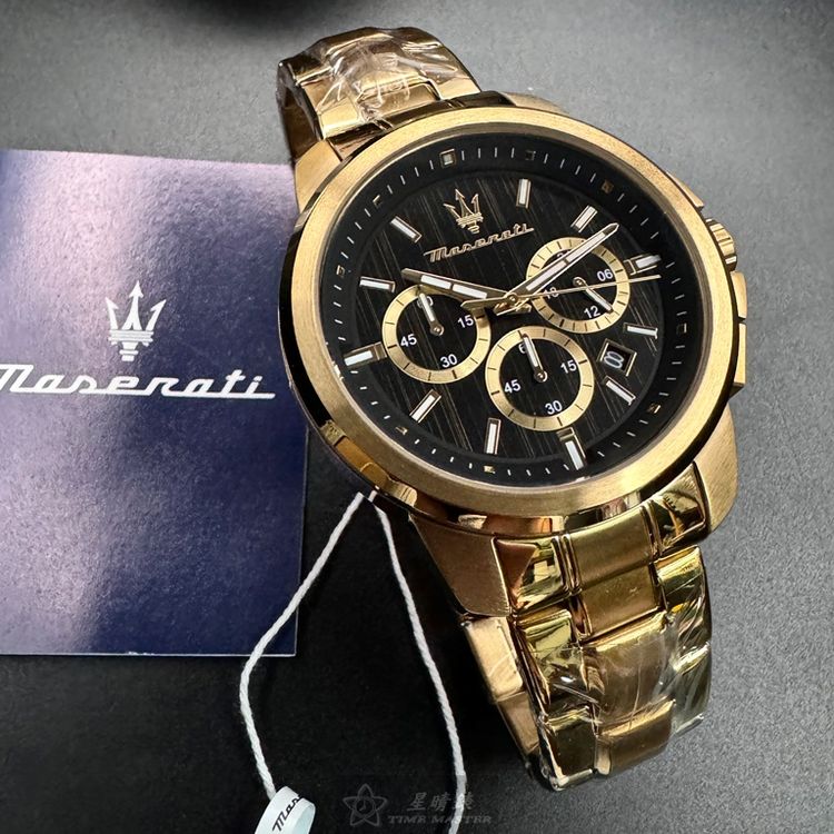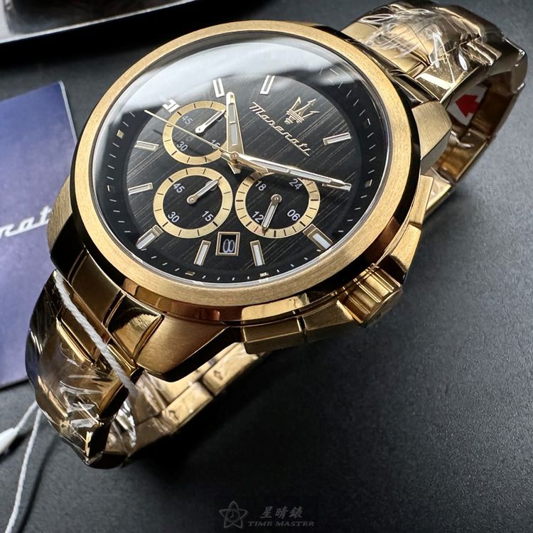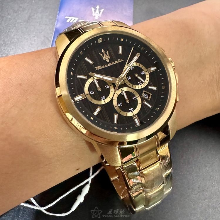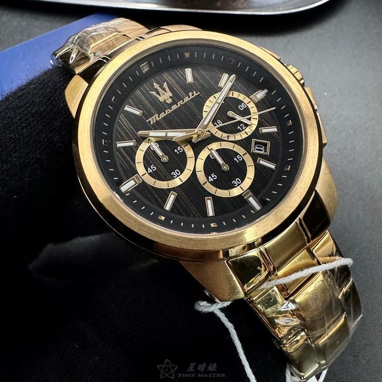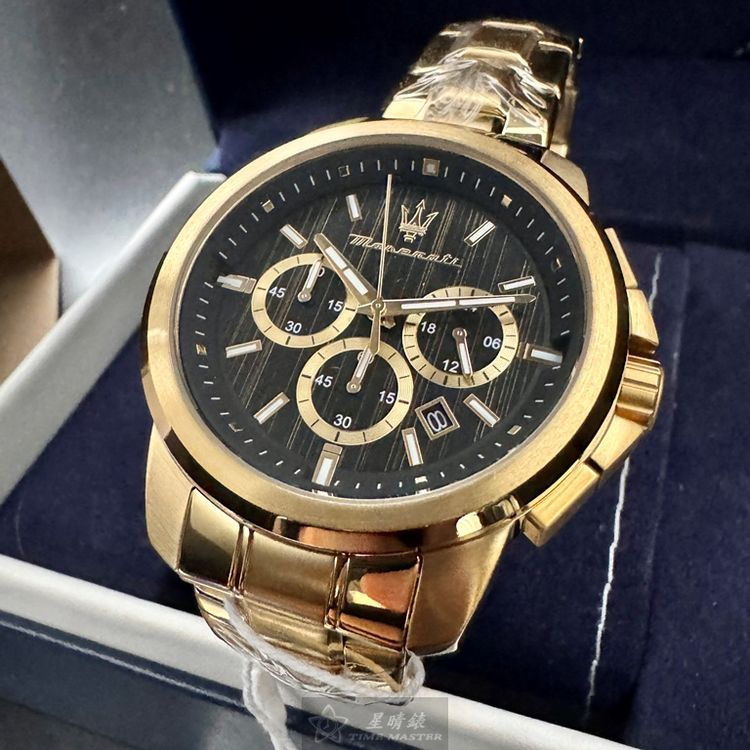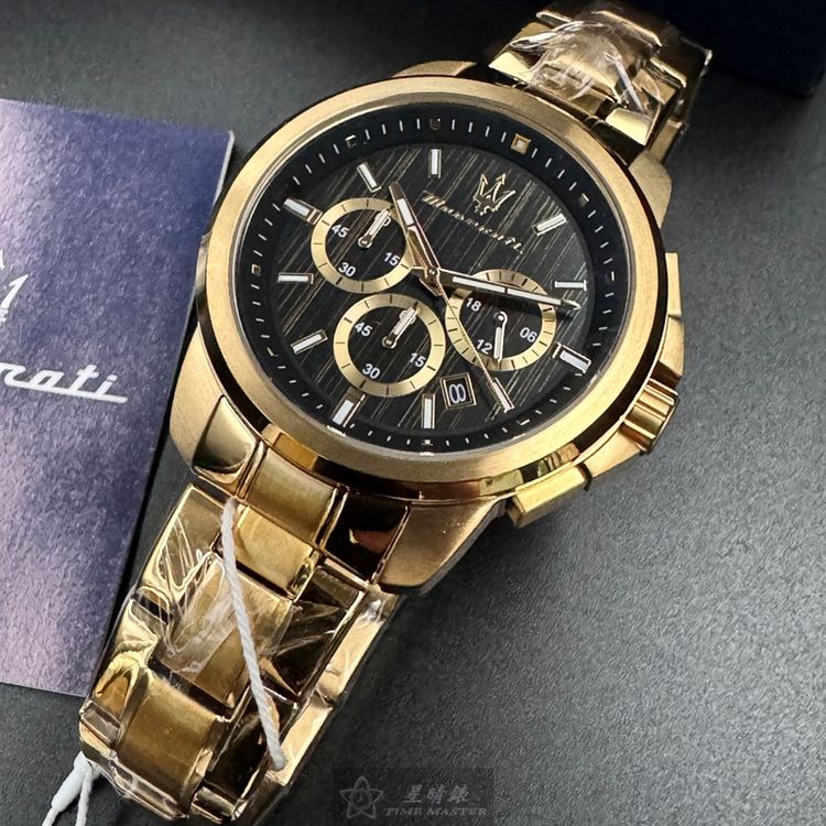 MASERATI手錶,編號R8873621013,44mm金色圓形精鋼錶殼,黑色三眼, 中三針顯示錶面,金色精鋼錶帶款