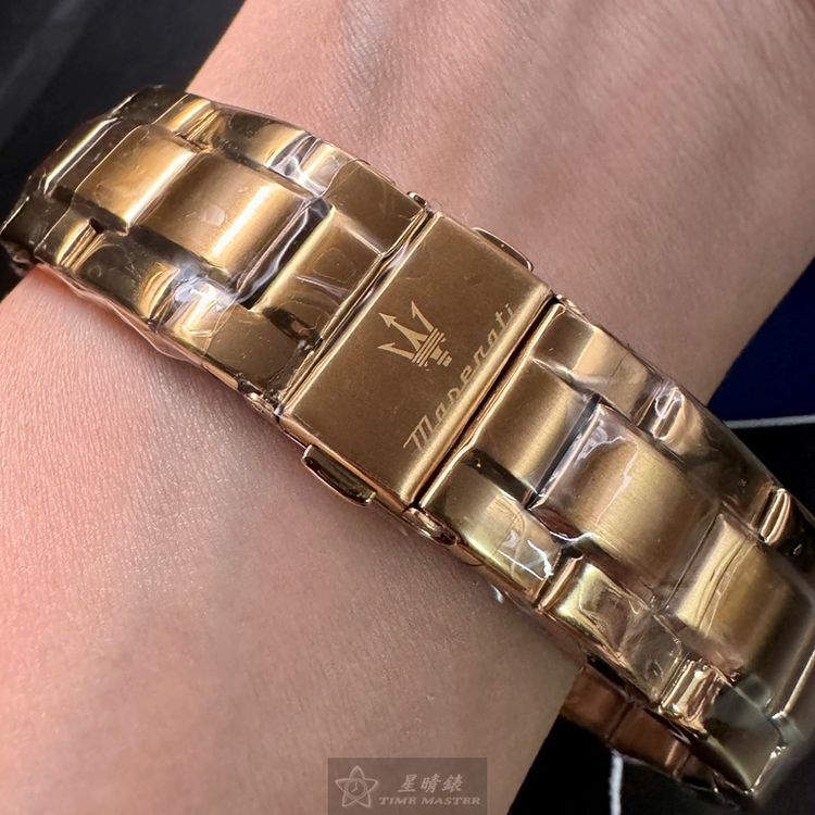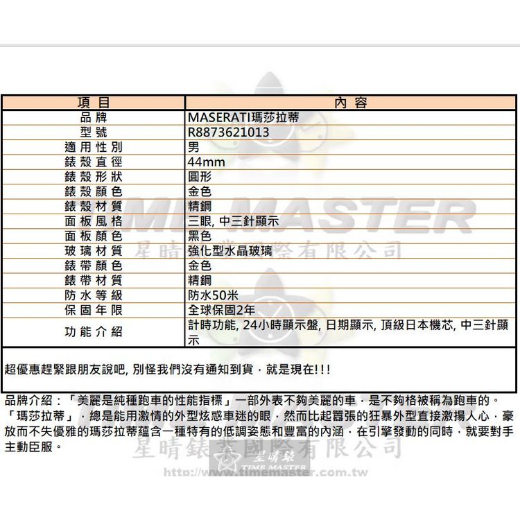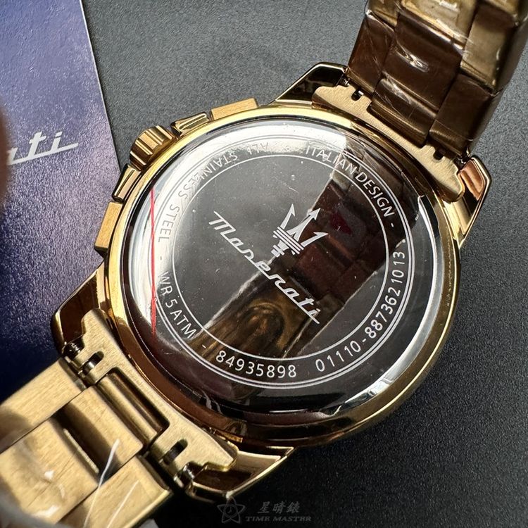 星晴錶業 MASERATI瑪莎拉蒂 R8873621013 男錶。44mm 金色精鋼錶殼,黑色三眼面板。強化型水晶玻璃保護,精鋼金色錶帶。頂級日本石英機芯,計時功能、24小時顯示盤、日期顯示應有盡有。防水50米,全球保固2年。獨特設計,彰顯男子風采。