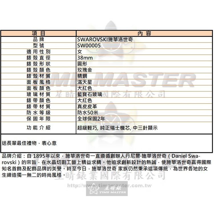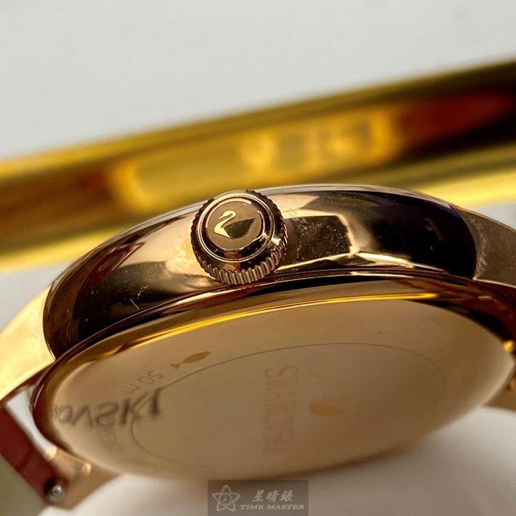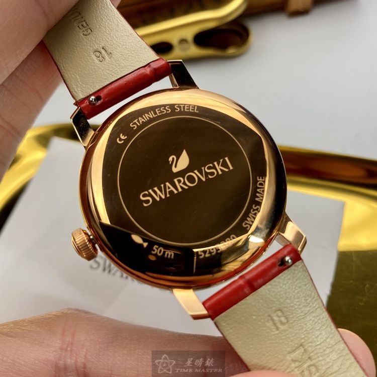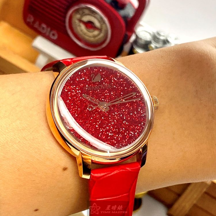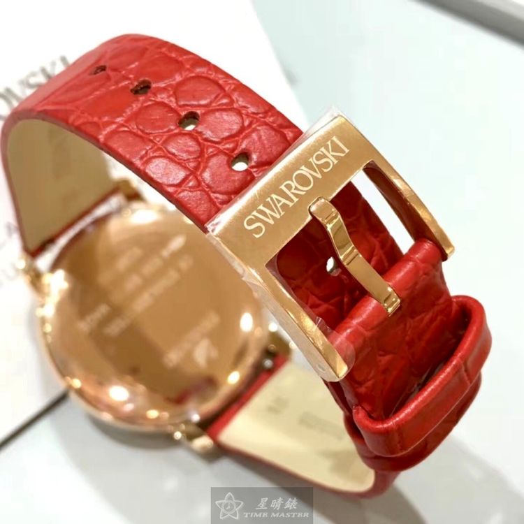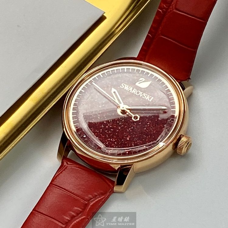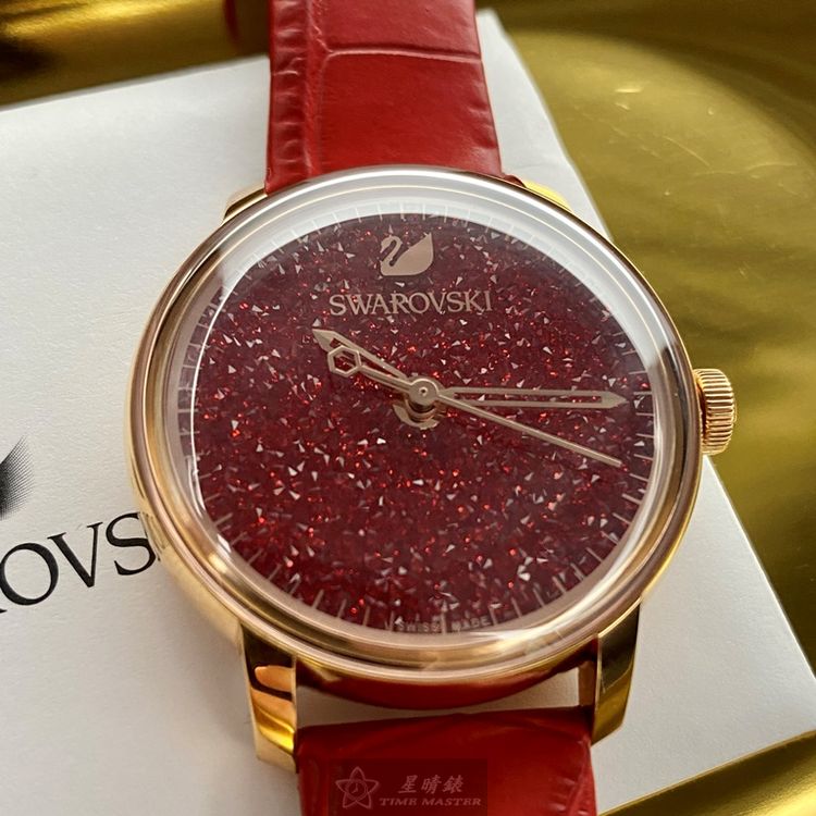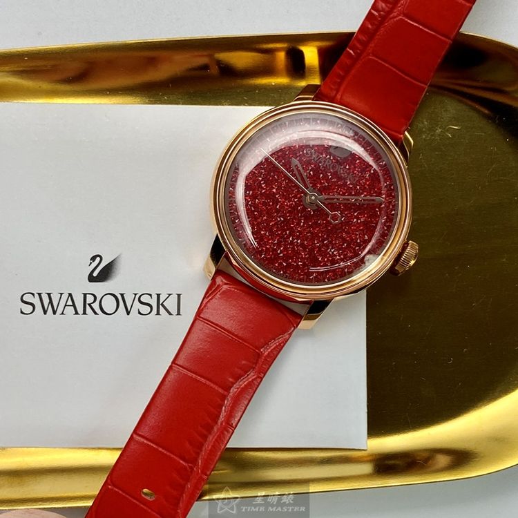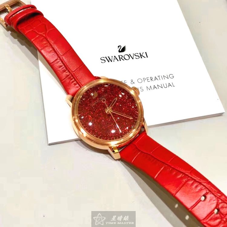SWAROVSKI手錶,編號SW00005,38mm玫瑰金圓形精鋼錶殼,大紅色滿天星錶面,大紅色真皮皮革錶帶款
