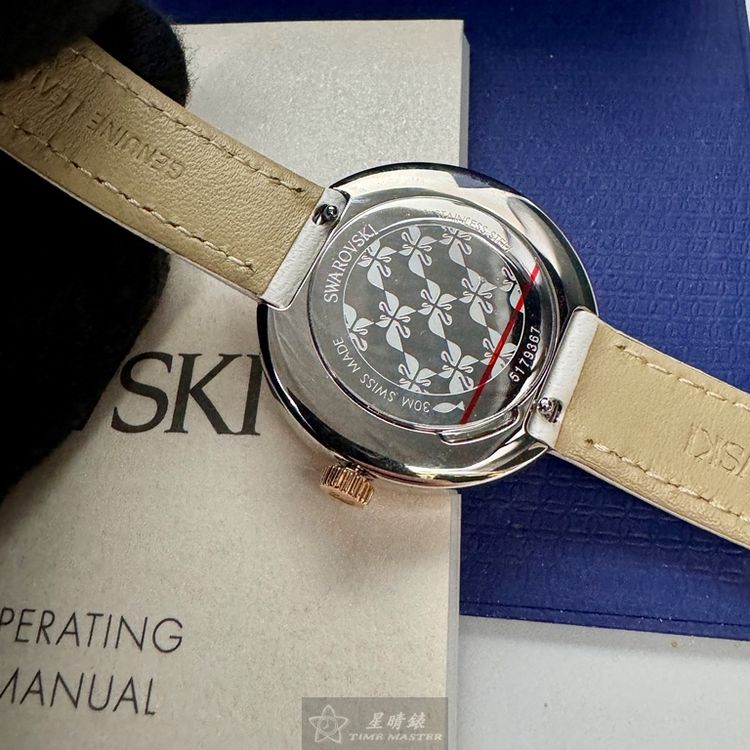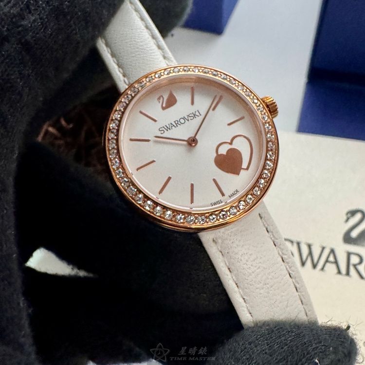 SWAROVSKI手錶,編號SW00020,34mm玫瑰金圓形精鋼錶殼,白色中三針顯示錶面,白真皮皮革錶帶款,可愛迷人