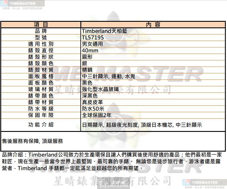 星晴錶業嚴選Timberland天柏藍TL57195男女通用腕錶,並非追求華麗外型,而是專注於穩定耐用的日常配戴價值。 這款40mm圓形精鋼錶殼設計,尺寸適中不挑手腕,無論男女都能自然融入日常穿搭。 黑色面盤搭配中三針顯示與運動風格配置,不走誇張路線,但在讀時清晰與實用性上表現紮實。 採用強化型水晶玻璃,日常使用中面對刮痕與碰撞,能提供基本而可靠的保護力。 內載頂級日本石英機芯,沒有多餘複雜功能,卻帶來穩定走時與低維護的實際優勢。 深黑色真皮皮革錶帶,配戴舒適貼手,長時間使用仍維持應有的質感與耐用度。 具備50米防水能力,雖不適合極限水上活動,但日常洗手與雨水環境足以安心應對。 夜光刻度與日期顯示功能,在光線不足或忙碌情境下,提供更直覺的讀時輔助。 價格或許不是市場最低,但我們更在意的是每一只交付出去的手錶,都具備長期使用的品質基礎。 星晴錶業肩負為顧客把關的責任,這款TL57195不一定完美,但在實用、耐用與穩定之間,做出了值得信任的平衡。