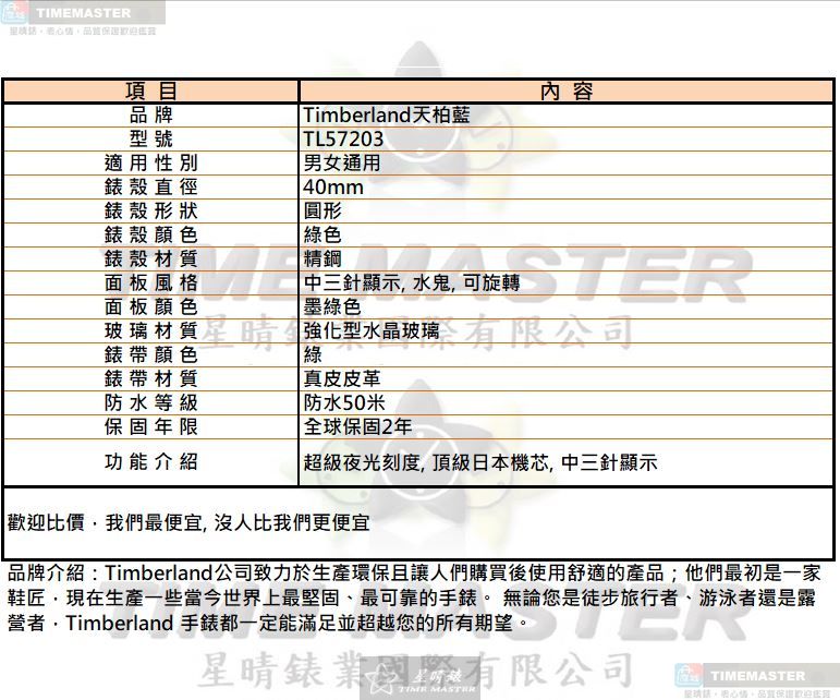 TimberLand手錶,編號TL57203,40mm綠色錶殼,綠錶帶款