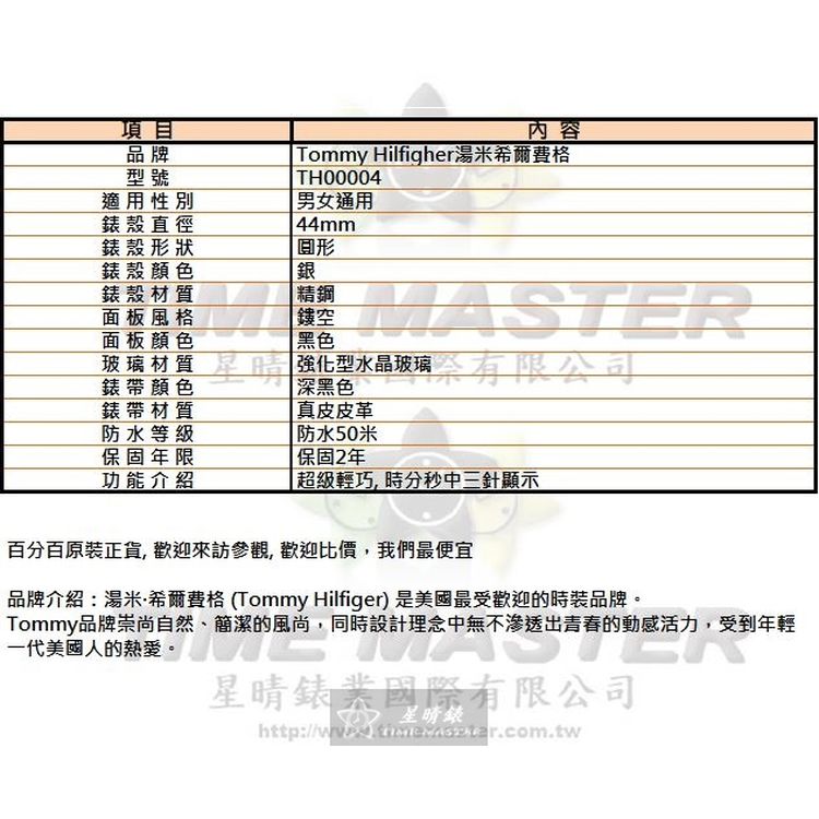 Tommy Hilfiger湯米希爾費格男女通用錶,編號TH00004,44mm銀錶殼,深黑色錶帶款