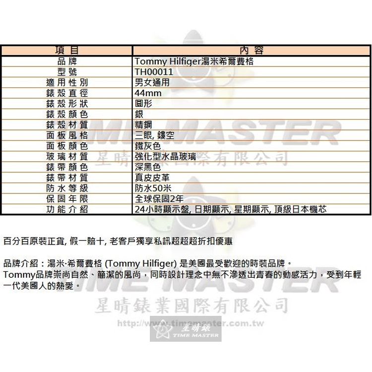 Tommy Hilfiger湯米希爾費格男女通用錶,編號TH00011,44mm銀錶殼,深黑色錶帶款