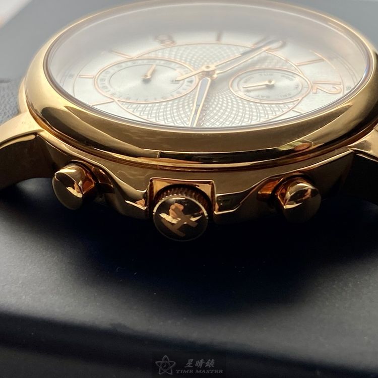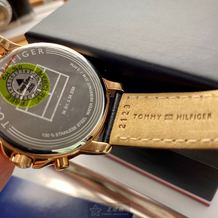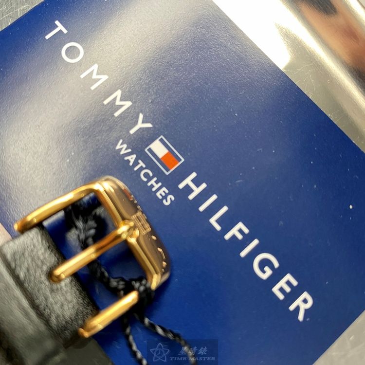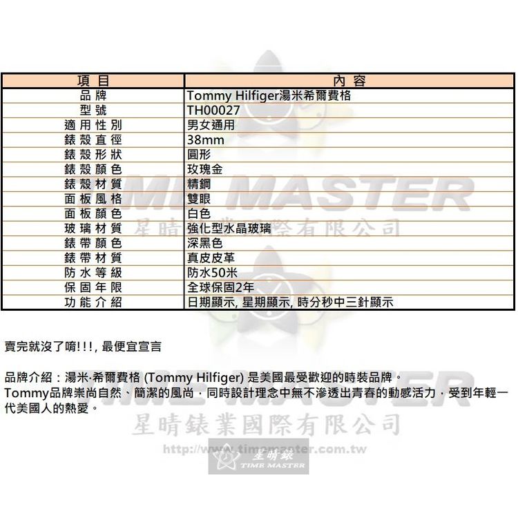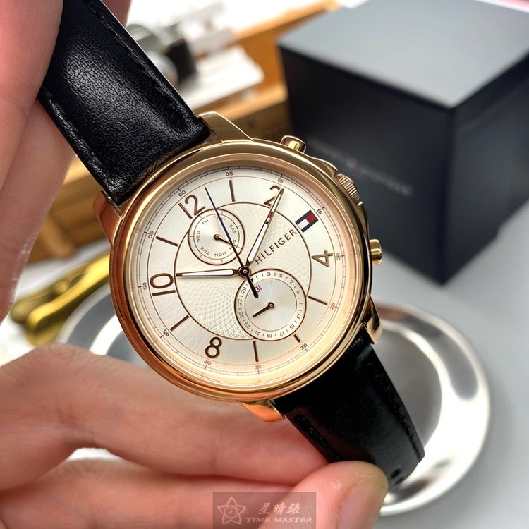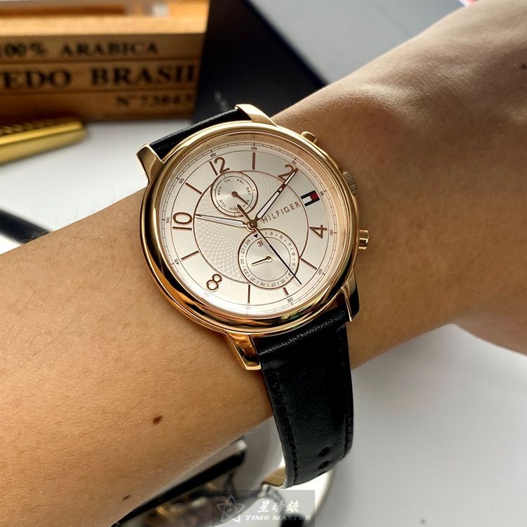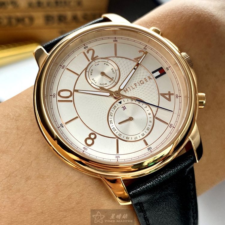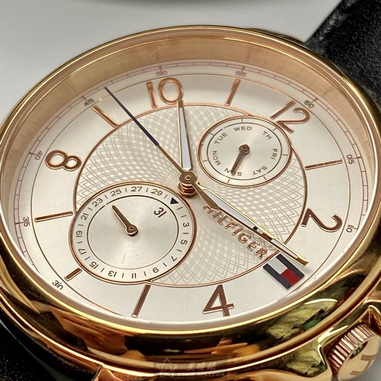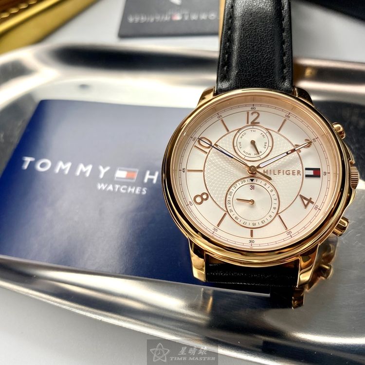 TommyHilfiger手錶,編號TH00027,38mm玫瑰金圓形精鋼錶殼,白色雙眼錶面,深黑色真皮皮革錶帶款