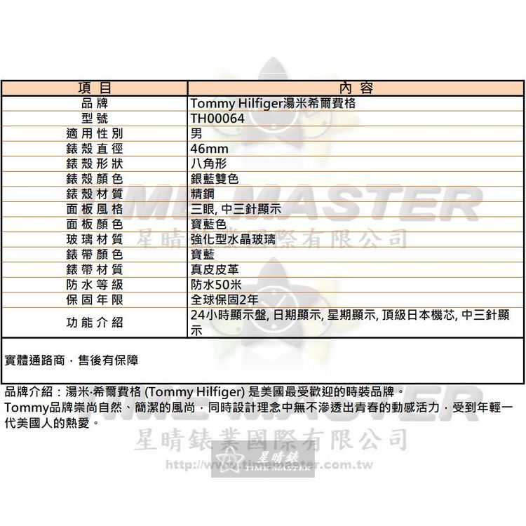 TommyHilfiger手錶,編號TH00064,46mm銀藍雙色錶殼,寶藍錶帶款