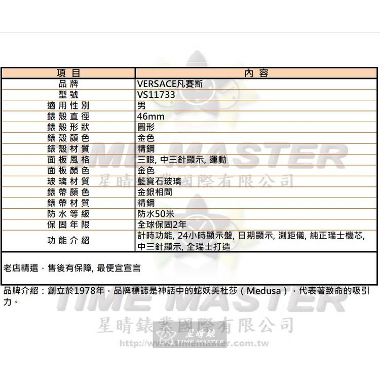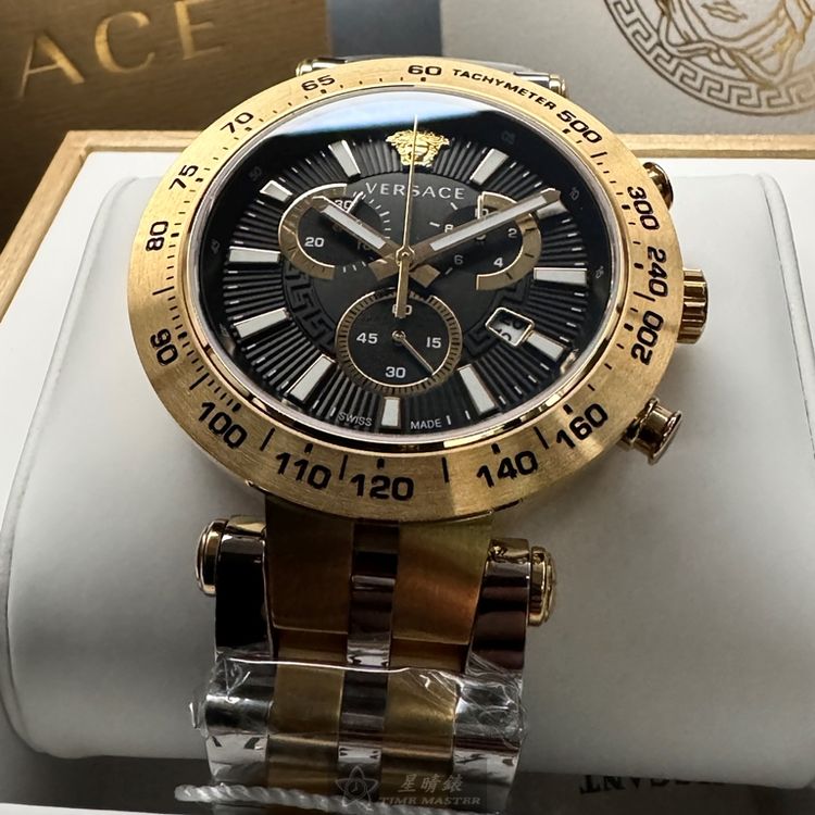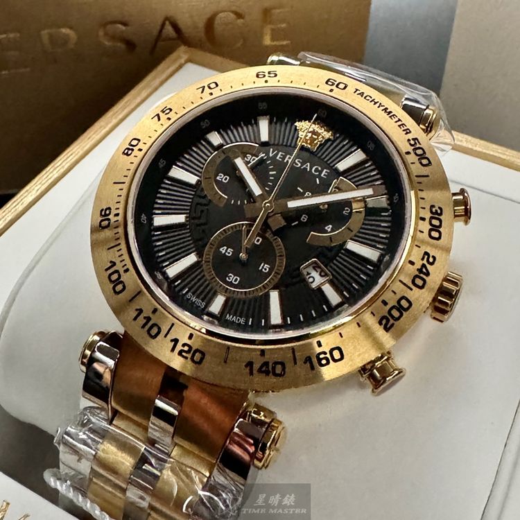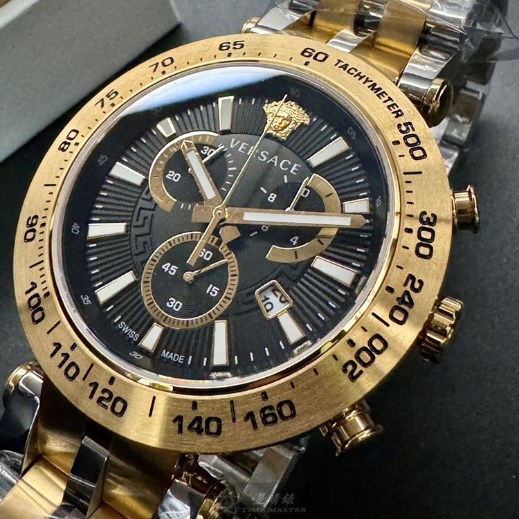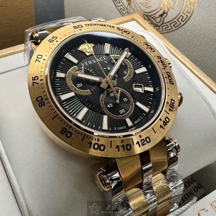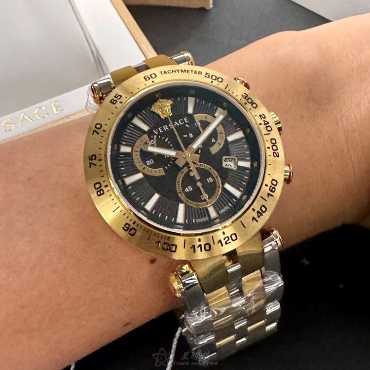 VERSACE手錶,編號VS11733,46mm金色圓形精鋼錶殼,金色三眼, 中三針顯示, 運動錶面,金銀相間精鋼錶帶款-[置頂推薦]