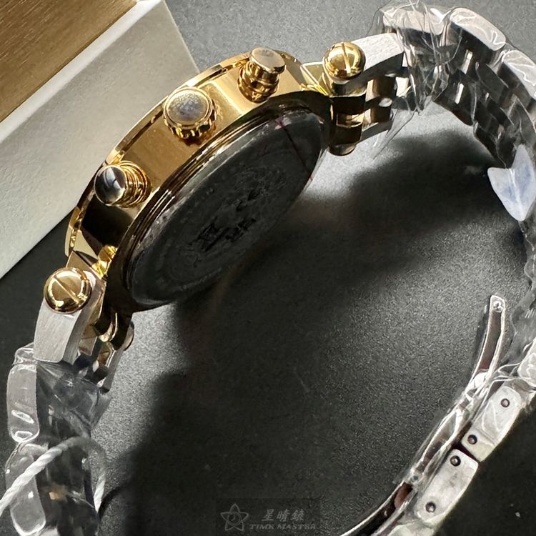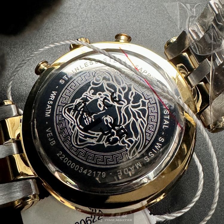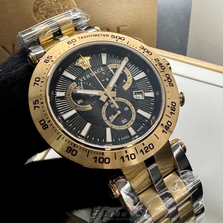 VERSACE手錶,編號VS11733,46mm金色圓形精鋼錶殼,金色三眼, 中三針顯示, 運動錶面,金銀相間精鋼錶帶款