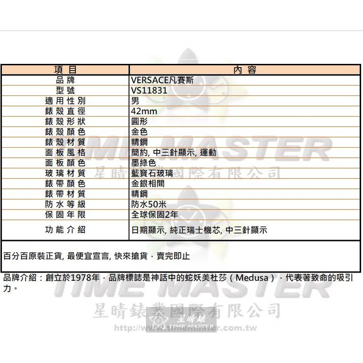 VERSACE手錶,編號VS11831,42mm金色錶殼,金銀相間錶帶款