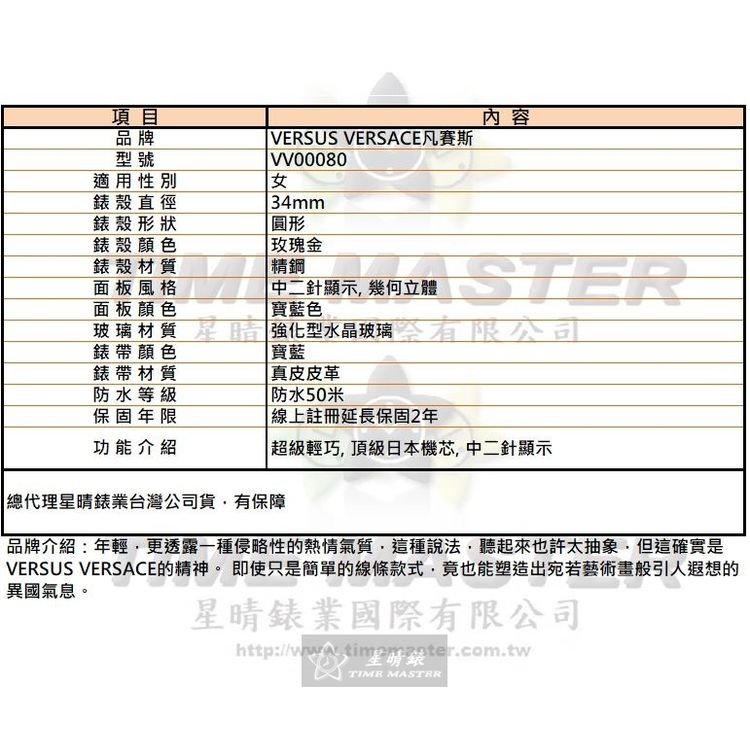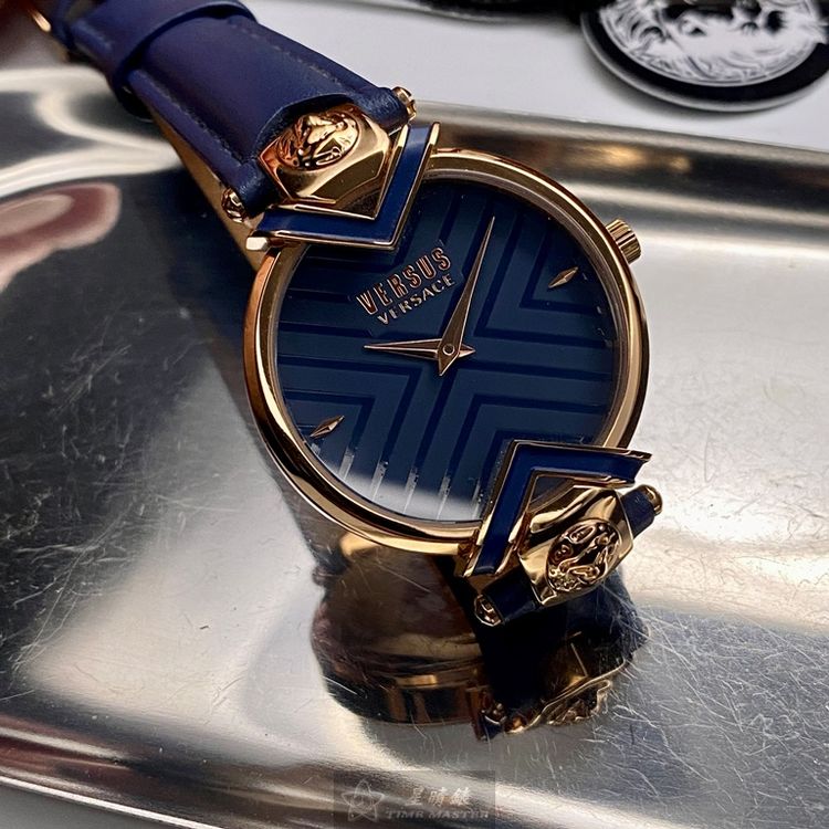 VERSUS VERSACE手錶,編號VV00080,34mm玫瑰金錶殼,寶藍錶帶款