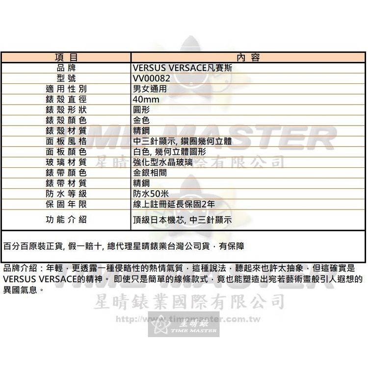 VERSUS VERSACE手錶,編號VV00082,40mm金色錶殼,金銀相間錶帶款