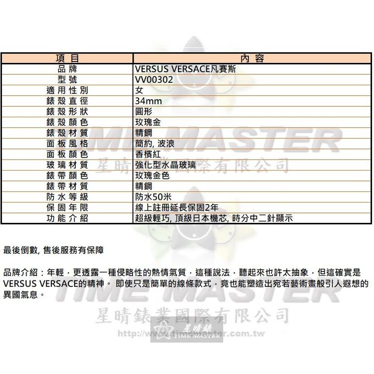 VERSUS VERSACE手錶,編號VV00302,34mm玫瑰金錶殼,玫瑰金色錶帶款