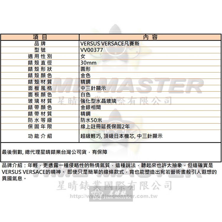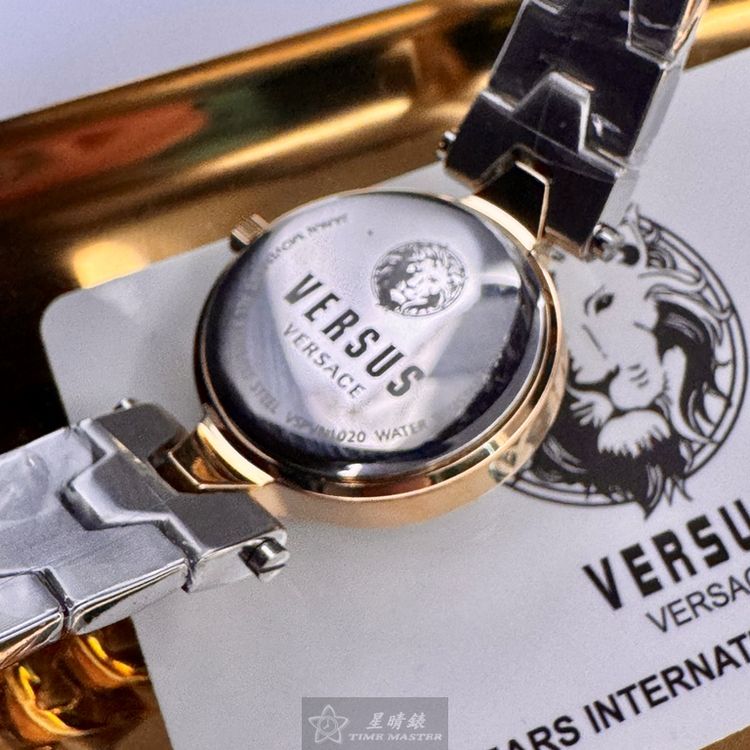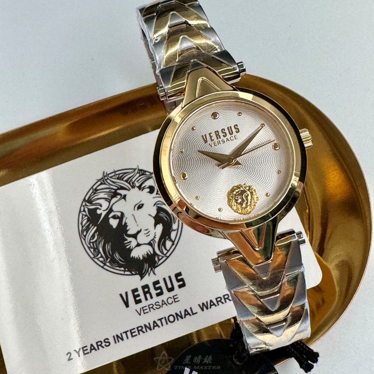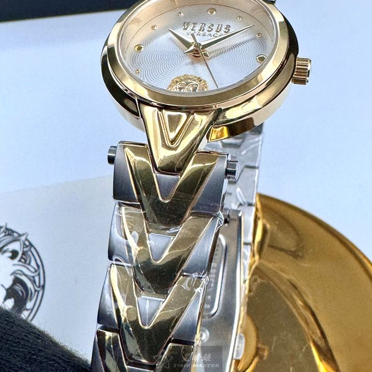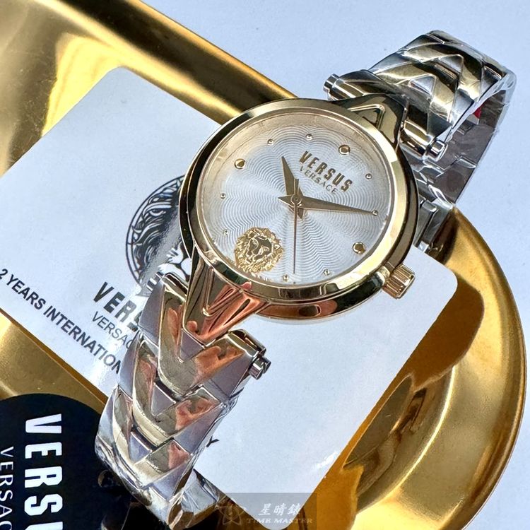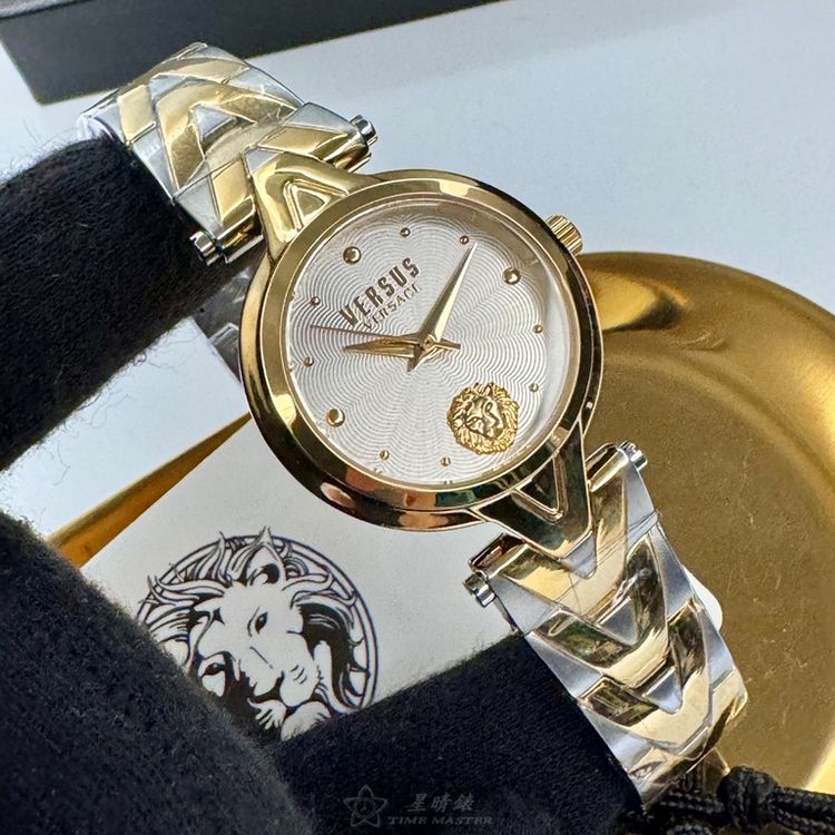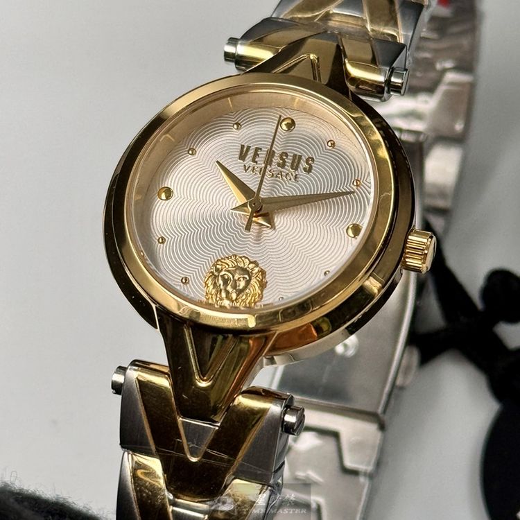 VERSUS VERSACE手錶,編號VV00377,30mm金色圓形精鋼錶殼,白色中三針顯示錶面,金銀相間精鋼錶帶款